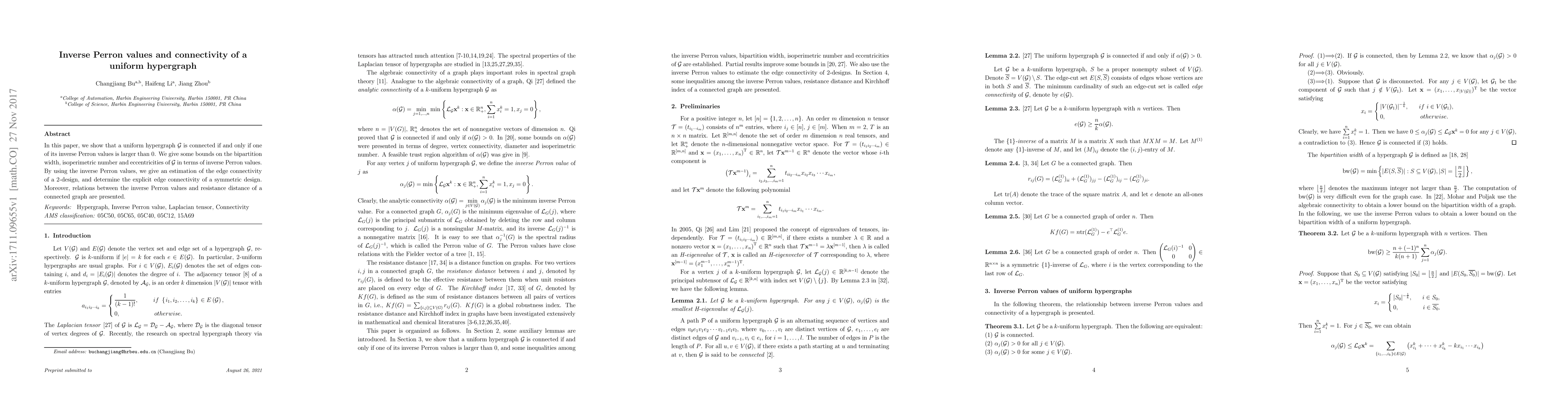 A uniform hypergraph is connected if one of its inverse Perron values is greater than 0, offering new bounds on graph properties and edge connectivity.