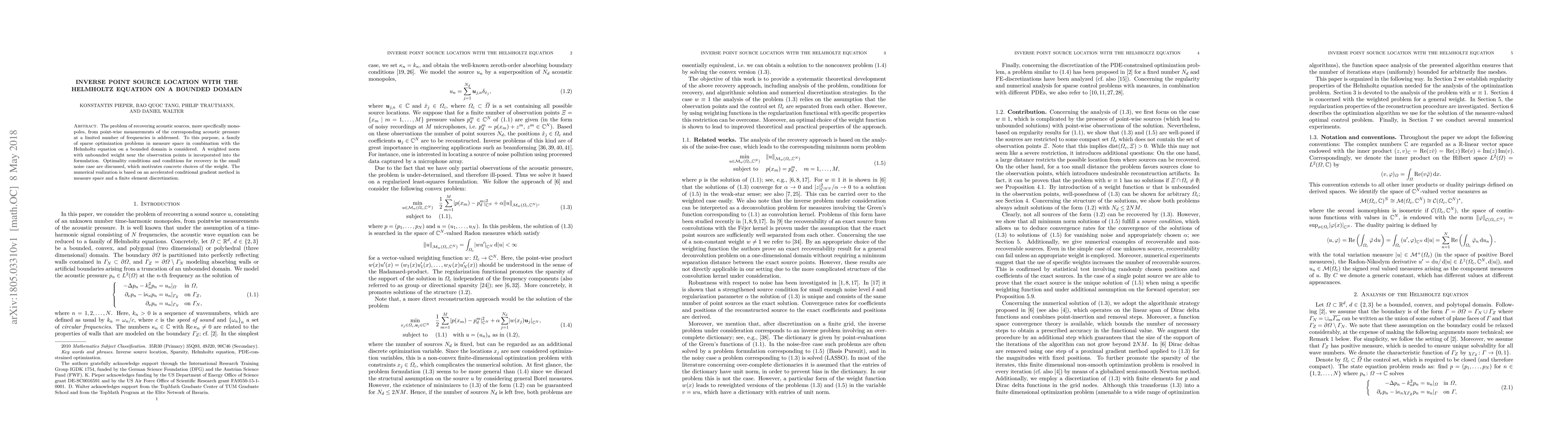 This paper addresses the inverse problem of locating acoustic monopole sources from limited frequency measurements using the Helmholtz equation. It proposes a sparse optimization approach in measure space with a weighted norm, discussing optimality and recovery conditions, and implements the solution via an accelerated conditional gradient method and finite element discretization.