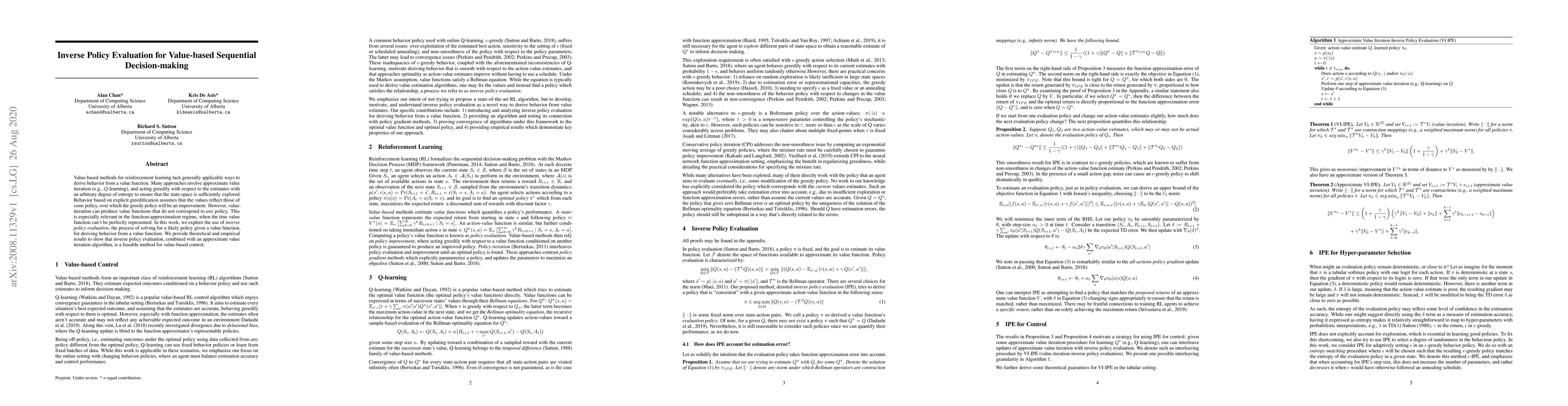 Value-based methods for reinforcement learning lack generally applicable ways to derive behavior from a value function. Many approaches involve approximate value iteration (e.g., $Q$-learning), and acting greedily with respect to the estimates with an arbitrary degree of entropy to ensure that the state-space is sufficiently explored. Behavior based on explicit greedification assumes that the values reflect those of \textit{some} policy, over which the greedy policy will be an improvement. However, value-iteration can produce value functions that do not correspond to \textit{any} policy. This is especially relevant in the function-approximation regime, when the true value function can't be perfectly represented. In this work, we explore the use of \textit{inverse policy evaluation}, the process of solving for a likely policy given a value function, for deriving behavior from a value function. We provide theoretical and empirical results to show that inverse policy evaluation, combined with an approximate value iteration algorithm, is a feasible method for value-based control.
