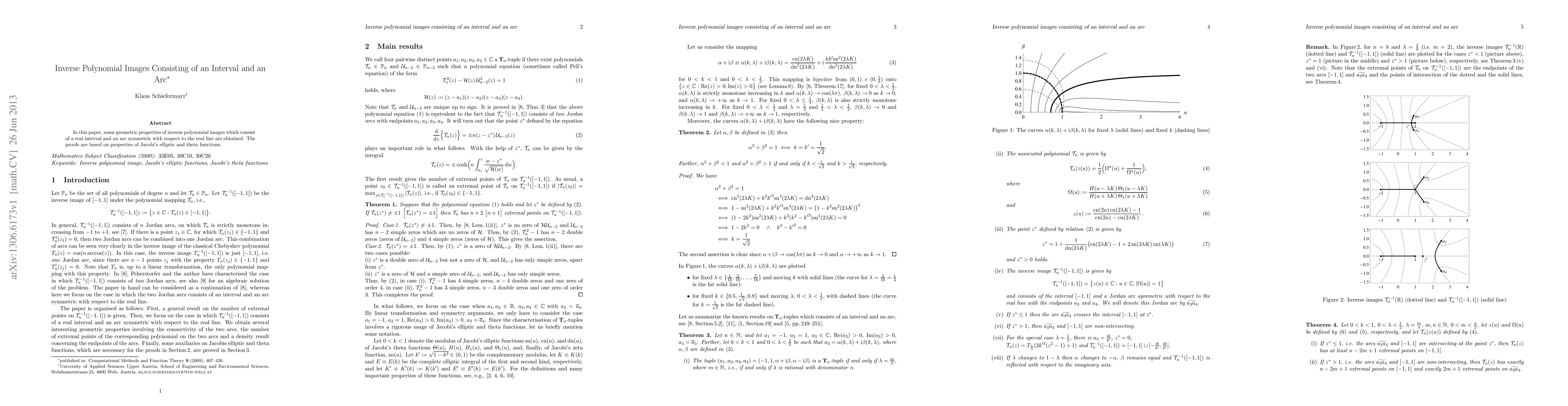In this paper, some geometric properties of inverse polynomial images which consist of a real interval and an arc symmetric with respect to the real line are obtained. The proofs are based on properties of Jacobi's elliptic and theta functions.
