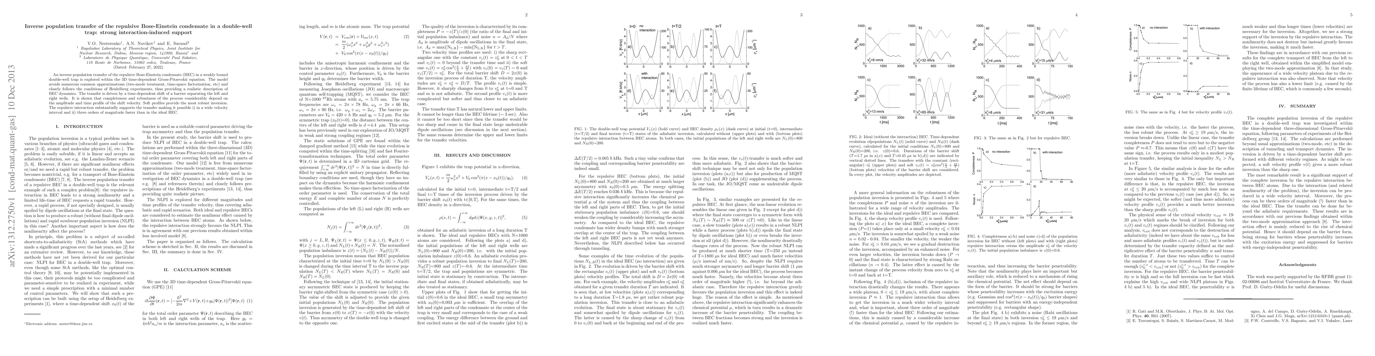 An inverse population transfer of the repulsive Bose-Einstein condensate (BEC) in a weakly bound double-well trap is explored within the 3D time-dependent Gross-Pitaevskii equation. The model avoids numerous common approximations (two-mode treatment, time-space factorization, etc) and closely follows the conditions of Heidelberg experiments, thus providing a realistic description of BEC dynamics. The transfer is driven by a time-dependent shift of a barrier separating the left and right wells. It is shown that completeness and robustness of the process considerably depend on the amplitude and time profile of the shift velocity. Soft profiles provide the most robust inversion. The repulsive interaction substantially supports the transfer making it possible i) in a wide velocity interval and ii) three orders of magnitude faster than in the ideal BEC.