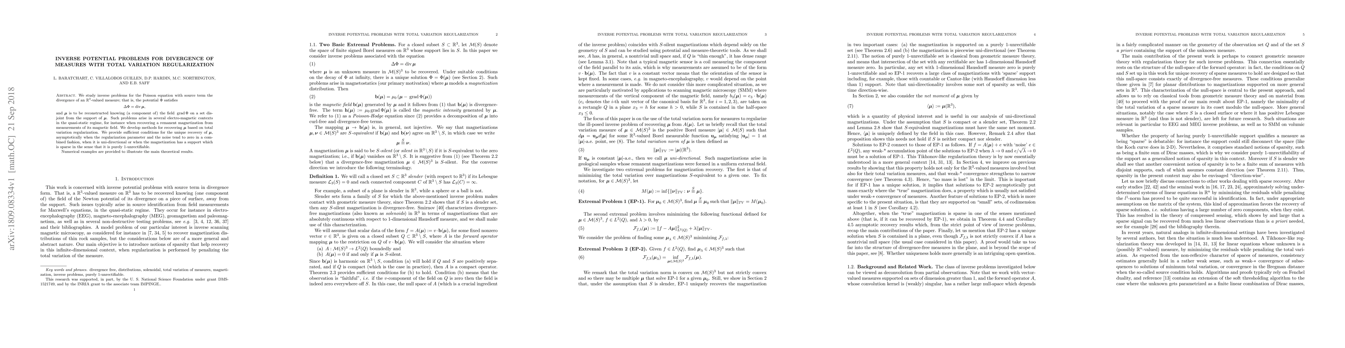 We study inverse problems for the Poisson equation with source term the divergence of an $\mathbf{R}^3$-valued measure, that is, the potential $\Phi$ satisfies $$ \Delta \Phi= \text{div} \boldsymbol{\mu}, $$ and $\boldsymbol{\mu}$ is to be reconstructed knowing (a component of) the field grad $\Phi$ on a set disjoint from the support of $\boldsymbol{\mu}$. Such problems arise in several electro-magnetic contexts in the quasi-static regime, for instance when recovering a remanent magnetization from measurements of its magnetic field. We develop methods for recovering $\boldsymbol{\mu}$ based on total variation regularization. We provide sufficient conditions for the unique recovery of $\boldsymbol{\mu}$, asymptotically when the regularization parameter and the noise tend to zero in a combined fashion, when it is uni-directional or when the magnetization has a support which is sparse in the sense that it is purely 1-unrectifiable. Numerical examples are provided to illustrate the main theoretical results.