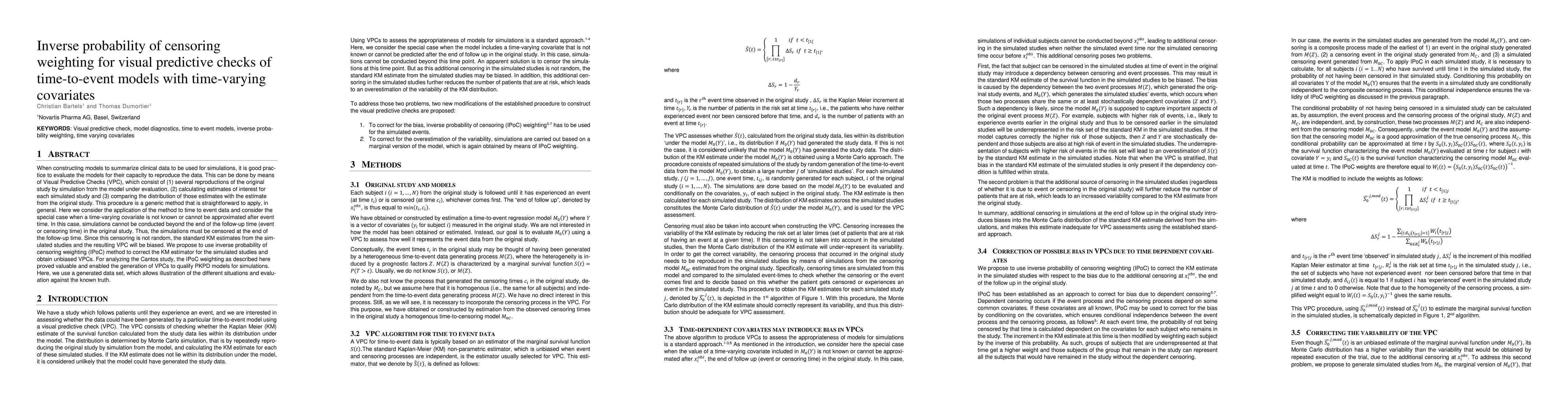 This research introduces Inverse Probability of Censoring Weighting (IPoC) to correct bias in Visual Predictive Checks (VPC) for time-to-event models with time-varying covariates. The method was validated using a generated dataset and applied to the Cantos study, demonstrating its utility in generating unbiased VPCs for PKPD model qualification.