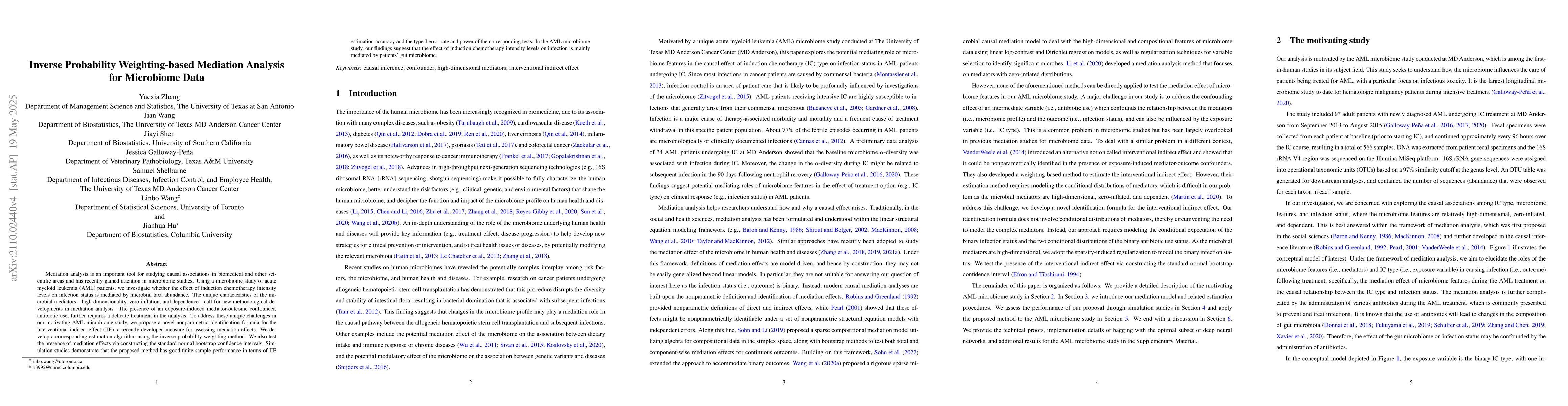 This paper proposes a novel inverse probability weighting method for mediation analysis in microbiome data, addressing high-dimensionality, zero-inflation, and dependence. The method is applied to study the mediation effect of gut microbiome on the relationship between chemotherapy intensity and infection status in AML patients, revealing significant mediation effects.