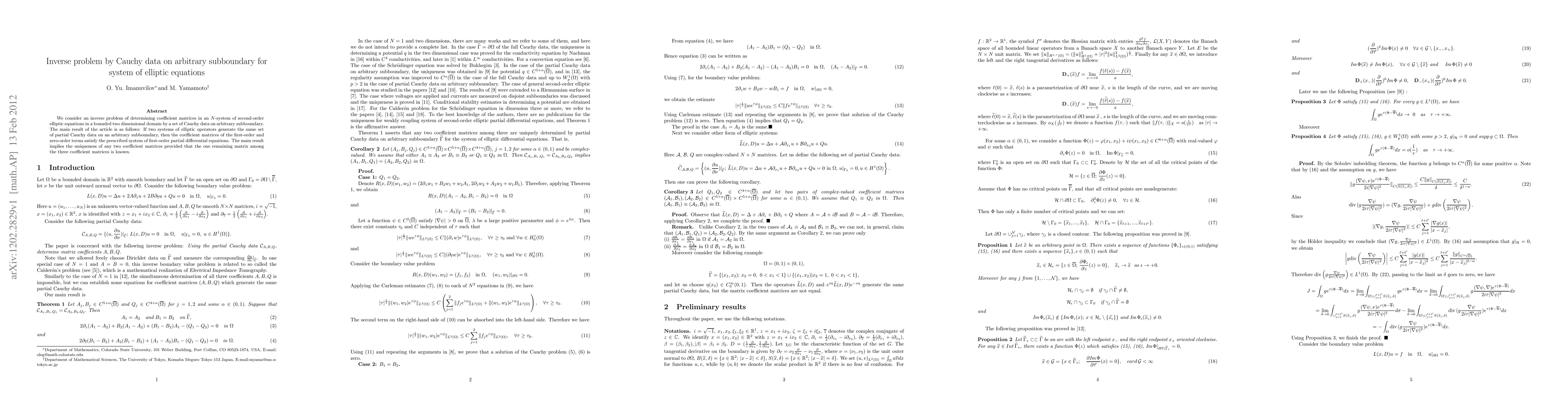This paper addresses an inverse problem for an $N$-system of second-order elliptic equations, focusing on determining coefficient matrices using Cauchy data on an arbitrary subboundary. The key finding is that if two systems yield identical partial Cauchy data on a subboundary, the coefficient matrices satisfy a specific system of first-order partial differential equations, ensuring uniqueness when one matrix is known.