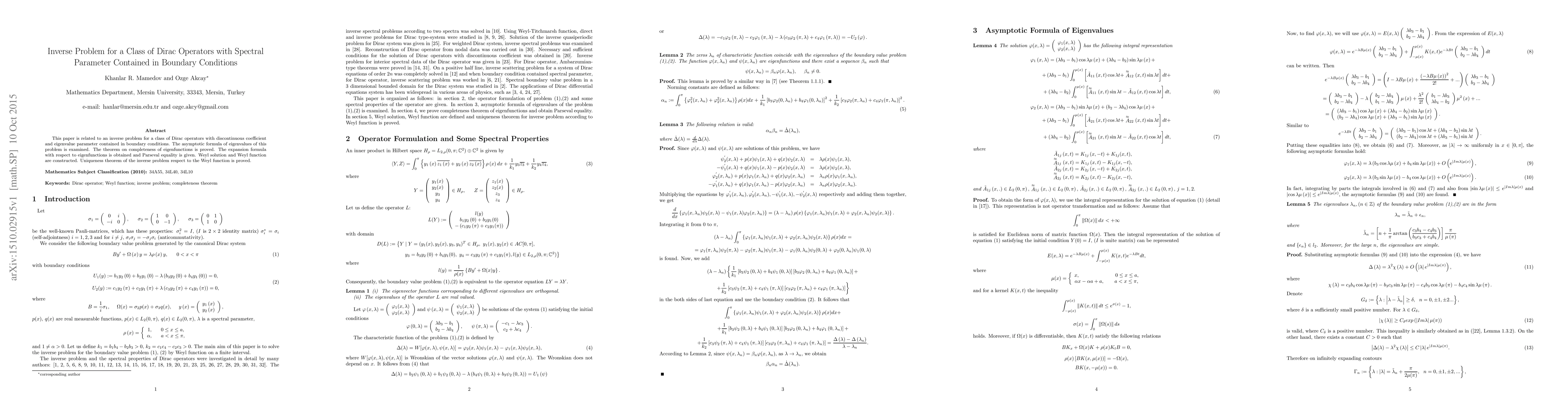 This paper addresses an inverse problem for Dirac operators with spectral parameters in boundary conditions, proving the completeness of eigenfunctions and deriving an expansion formula. It establishes a uniqueness theorem for the inverse problem using the Weyl function.