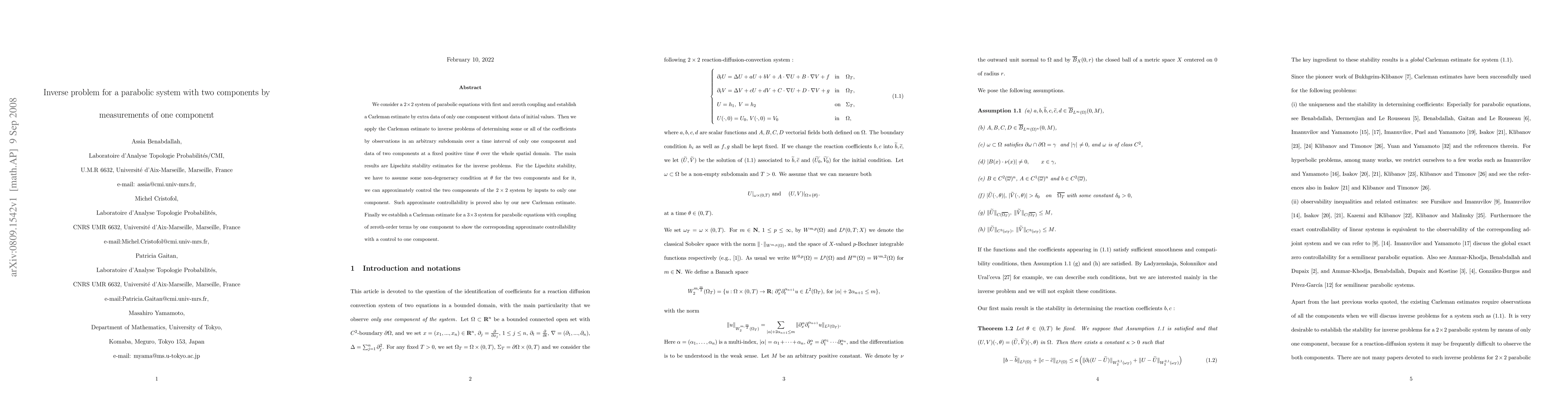 This paper establishes a Carleman estimate for a $2\times 2$ system of parabolic equations using measurements of only one component, and applies it to determine coefficients via inverse problems. It proves Lipschitz stability under non-degeneracy conditions and demonstrates approximate controllability for both the $2\times 2$ and $3\times 3$ systems.