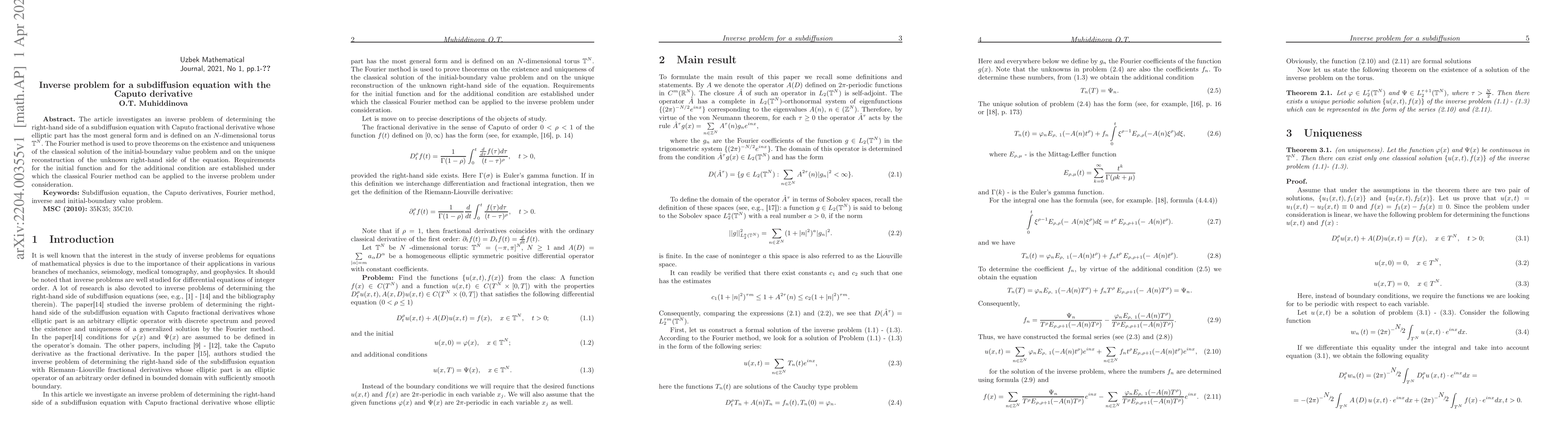 The article investigates an inverse problem of determining the right-hand side of a subdiffusion equation with Caputo fractional derivative whose elliptic part has the most general form and is defined on an N-dimensional torus T N . The Fourier method is used to prove theorems on the existence and uniqueness of the classical solution of the initial-boundary value problem and on the unique reconstruction of the unknown right-hand side of the equation. Requirements for the initial function and for the additional condition are established under which the classical Fourier method can be applied to the inverse problem under consideration.