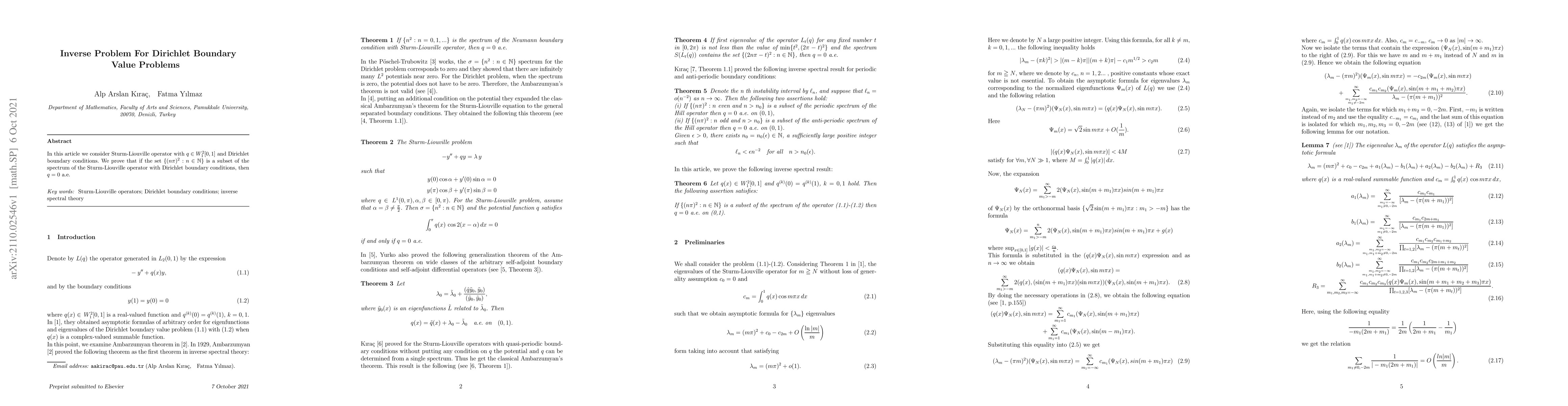 In this article we consider Sturm-Liouville operator with $q\in W_{1}^{2}[0,1]$ and Dirichlet boundary conditions. We prove that if the set $\{(n\pi)^{2}:n\in \mathbb{N}\}$ is a subset of the spectrum of the Sturm-Liouville operator with Dirichlet boundary conditions, then $q=0$ a.e.