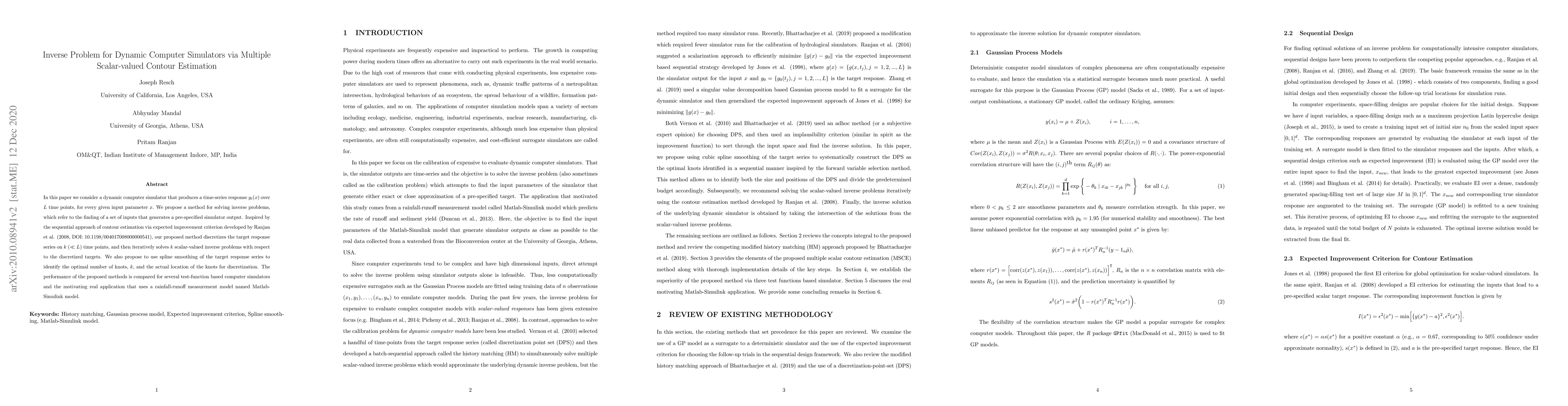 This paper proposes a method for solving inverse problems in dynamic computer simulators using multiple scalar-valued contour estimation, enabling the identification of optimal input parameters from pre-specified simulator outputs.