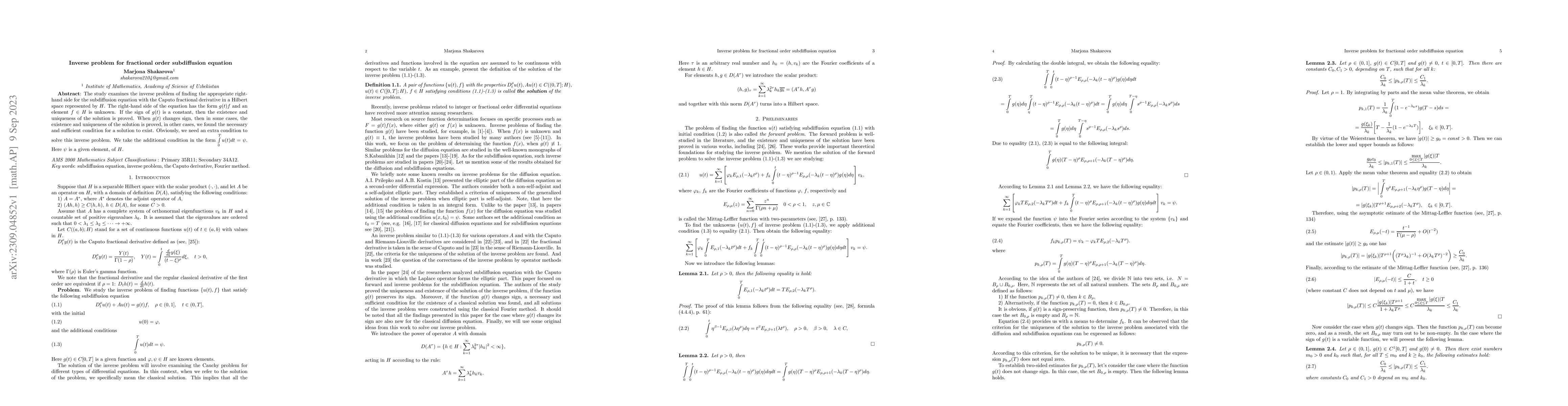 This paper investigates the inverse problem for a fractional order subdiffusion equation with a Caputo fractional derivative, focusing on determining the unknown right-hand side $g(t)f$ in a Hilbert space $H$. The study proves the existence and uniqueness of solutions when $g(t)$ is constant, and provides conditions for solutions when $g(t)$ changes sign, requiring an additional constraint $\int\limits_0^Tu(t)dt=\psi$.