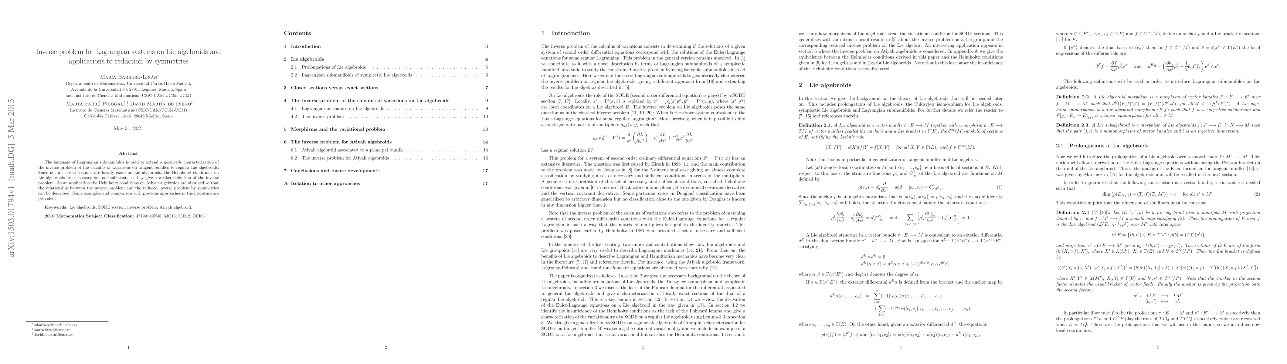This paper extends the inverse problem of the calculus of variations from tangent bundles to regular Lie algebroids using Lagrangian submanifolds, showing that Helmholtz conditions are necessary but not sufficient for the problem's solution. It also explores the relationship between this inverse problem and reduced inverse problems by symmetries, providing examples and comparing with existing literature.