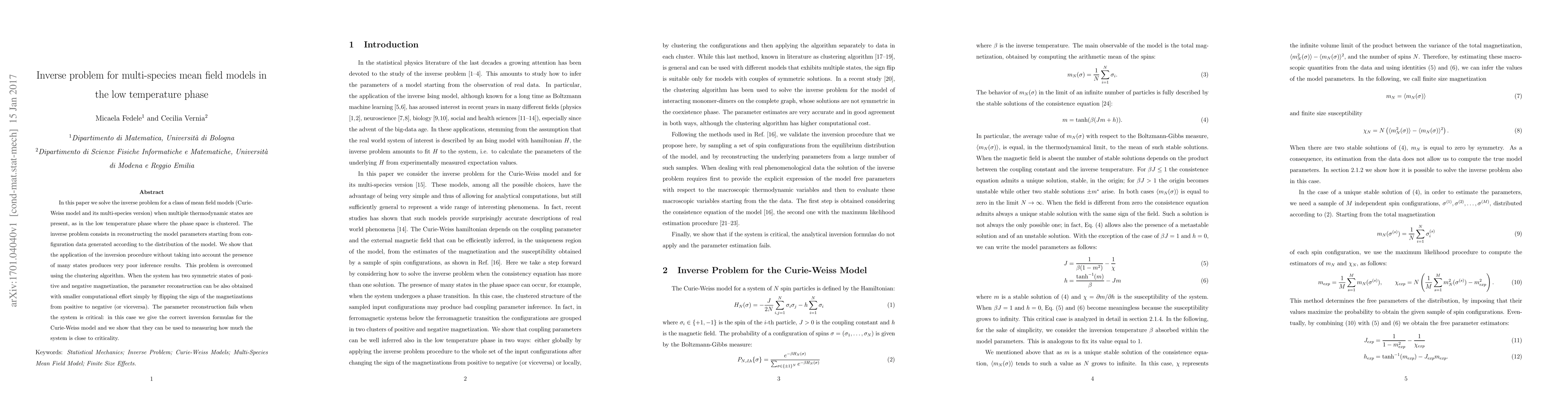 This paper addresses the inverse problem for multi-species mean field models in low temperature phases, demonstrating that reconstruction of model parameters is significantly improved by using clustering algorithms to account for multiple thermodynamic states. It also shows that flipping magnetization signs can simplify parameter reconstruction for symmetric states.