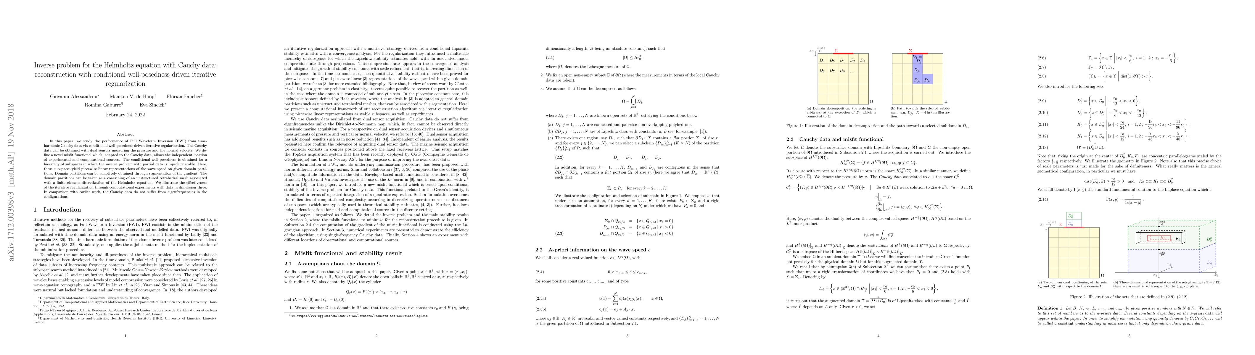 In this paper, we study the performance of Full Waveform Inversion (FWI) from time-harmonic Cauchy data via conditional well-posedness driven iterative regularization. The Cauchy data can be obtained with dual sensors measuring the pressure and the normal velocity. We define a novel misfit functional which, adapted to the Cauchy data, allows the independent location of experimental and computational sources. The conditional well-posedness is obtained for a hierarchy of subspaces in which the inverse problem with partial data is Lipschitz stable. Here, these subspaces yield piecewise linear representations of the wave speed on given domain partitions. Domain partitions can be adaptively obtained through segmentation of the gradient. The domain partitions can be taken as a coarsening of an unstructured tetrahedral mesh associated with a finite element discretization of the Helmholtz equation. We illustrate the effectiveness of the iterative regularization through computational experiments with data in dimension three. In comparison with earlier work, the Cauchy data do not suffer from eigenfrequencies in the configurations.