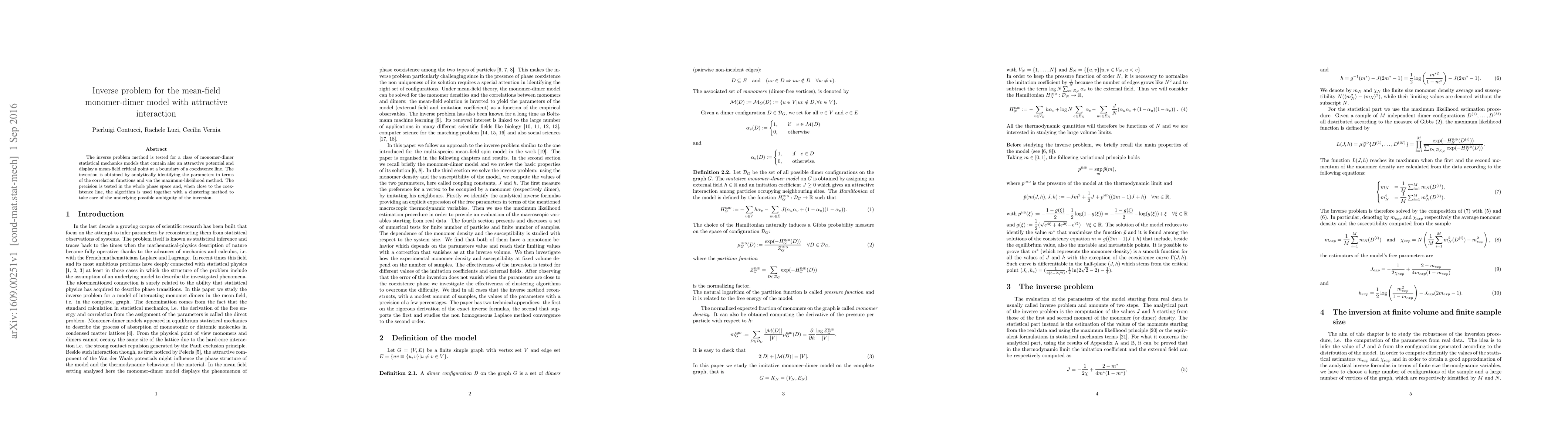 This paper investigates the inverse problem for a mean-field monomer-dimer model with attractive interactions, using analytical methods to identify model parameters from correlation functions. The precision of the inversion is tested across the phase space, with additional clustering techniques employed near the coexistence line to address potential ambiguities.