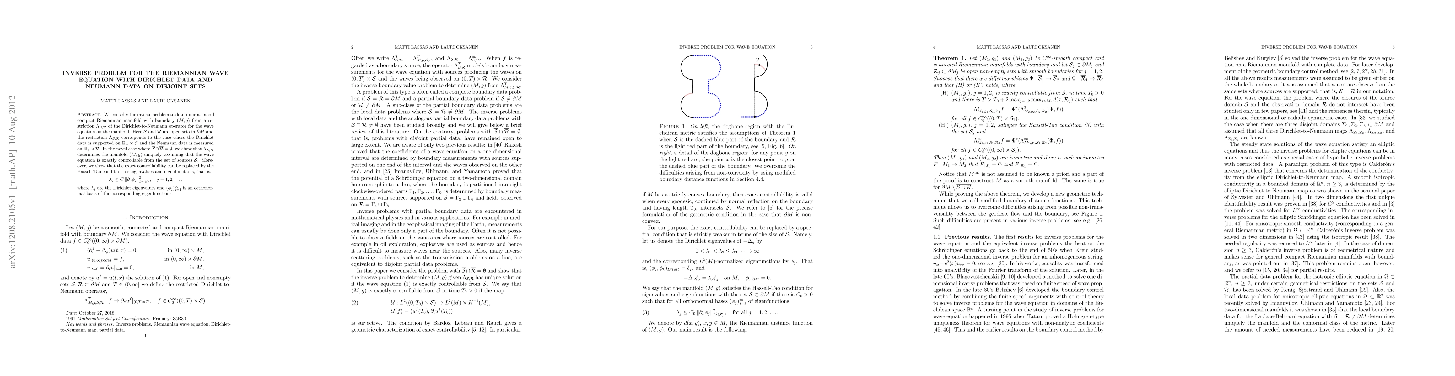 Researchers show that a unique smooth compact Riemannian manifold can be determined from Dirichlet-to-Neumann operator restrictions on disjoint sets, assuming exact controllability of the wave equation.