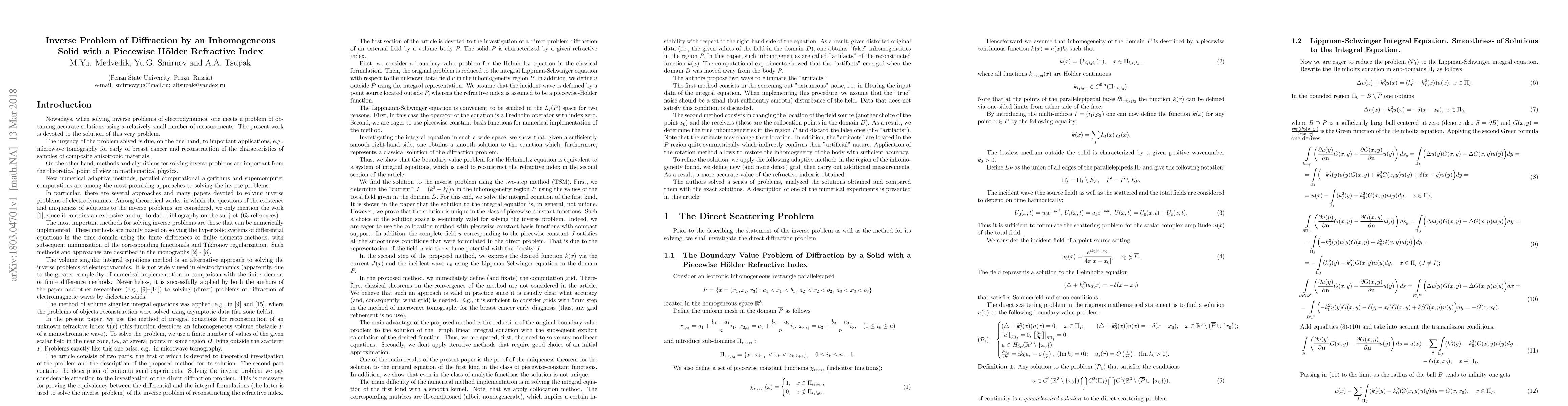 This paper addresses the inverse problem of reconstructing an unknown piecewise Hölder refractive index of an inhomogeneous solid using a two-step method. The solution involves determining a current function from the integral Lippman-Schwinger equation and expressing the refractive index via this current and the incident wave, proving the uniqueness of the solution. The method's efficiency is validated through a test problem.