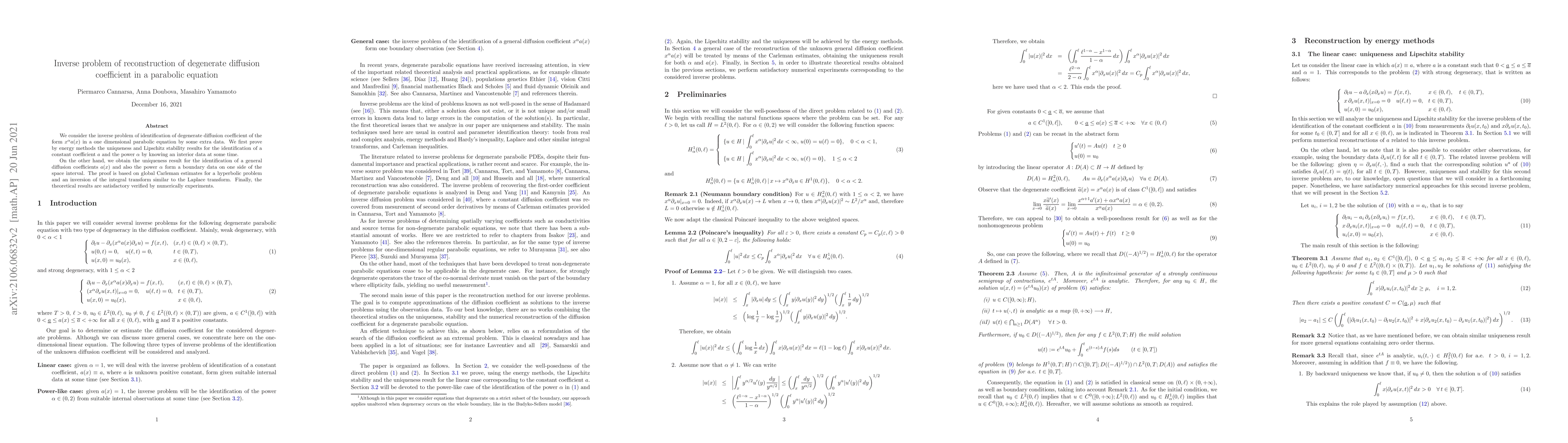 This paper addresses the inverse problem of identifying a degenerate diffusion coefficient in a one-dimensional parabolic equation using extra data. It proves uniqueness and stability for constant coefficients and power terms via energy methods and global Carleman estimates, validated by numerical experiments.