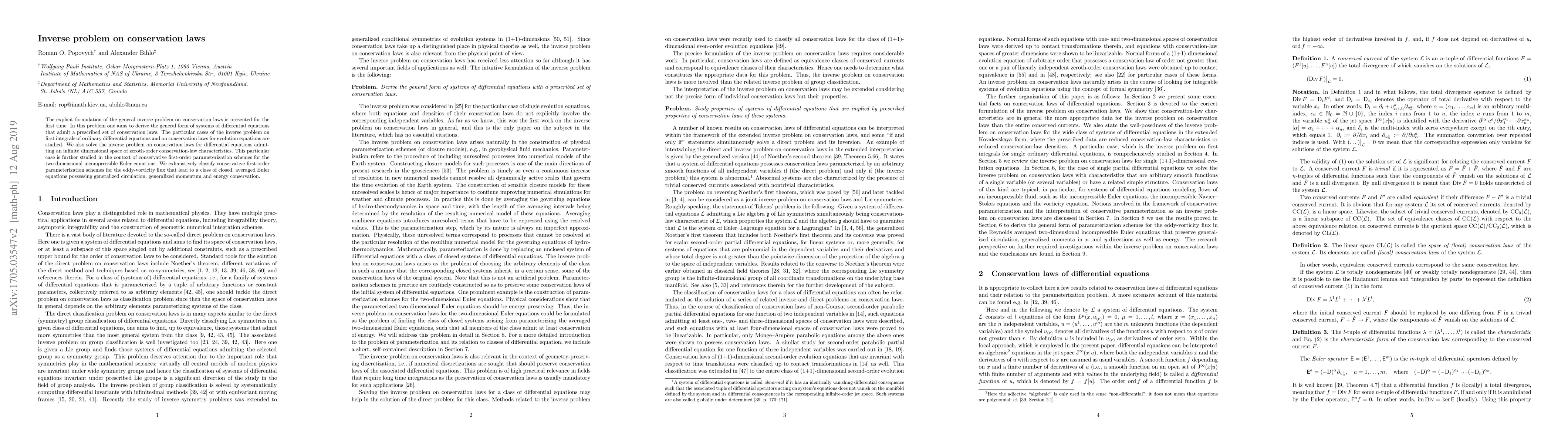 This paper presents the first explicit formulation of the inverse problem on conservation laws, aiming to derive systems of differential equations with a given set of conservation laws. It examines specific cases for ordinary differential equations and evolution equations, and delves into schemes for the two-dimensional incompressible Euler equations, classifying conservative first-order parameterizations that maintain generalized circulation, momentum, and energy conservation.