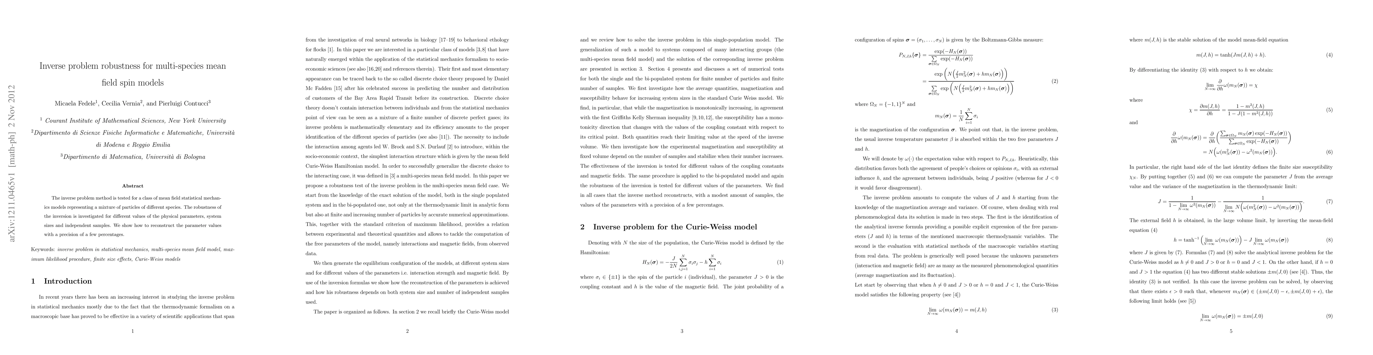 This paper investigates the robustness of the inverse problem method for multi-species mean field spin models, demonstrating the ability to reconstruct physical parameters with high precision across various system sizes and conditions. The study highlights the reliability of the inversion technique in diverse scenarios.