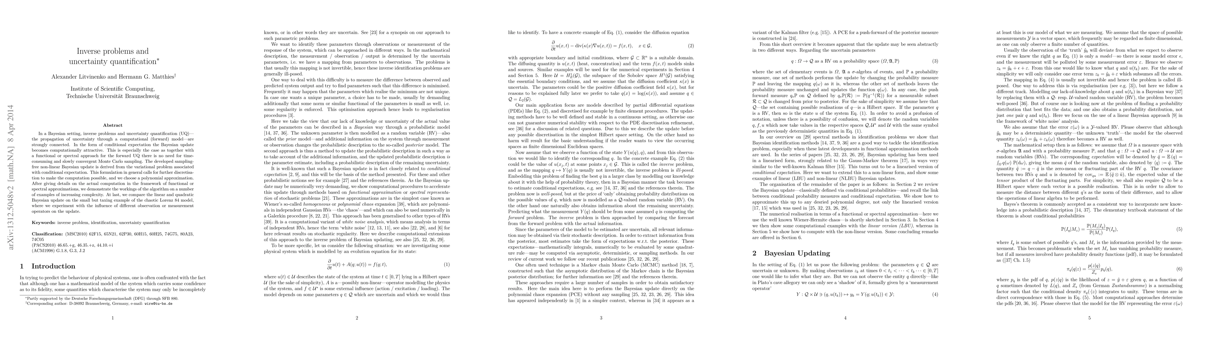 In a Bayesian setting, inverse problems and uncertainty quantification (UQ) - the propagation of uncertainty through a computational (forward) model - are strongly connected. In the form of conditional expectation the Bayesian update becomes computationally attractive. This is especially the case as together with a functional or spectral approach for the forward UQ there is no need for time-consuming and slowly convergent Monte Carlo sampling. The developed sampling-free non-linear Bayesian update is derived from the variational problem associated with conditional expectation. This formulation in general calls for further discretisation to make the computation possible, and we choose a polynomial approximation. After giving details on the actual computation in the framework of functional or spectral approximations, we demonstrate the workings of the algorithm on a number of examples of increasing complexity. At last, we compare the linear and quadratic Bayesian update on the small but taxing example of the chaotic Lorenz 84 model, where we experiment with the influence of different observation or measurement operators on the update.