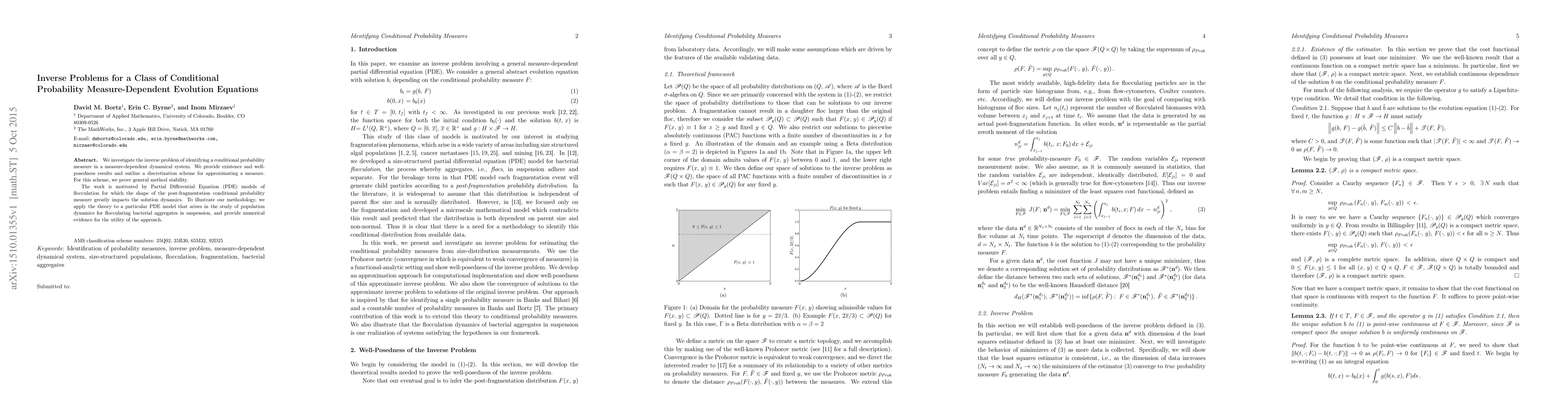 This research explores the inverse problem of determining a conditional probability measure in measure-dependent dynamical systems, with a focus on PDE models of flocculation. The study provides existence and well-posedness results, a discretization scheme for approximating measures, and stability proof for the method. It demonstrates the approach's utility using a specific PDE model of bacterial aggregate population dynamics in suspension.