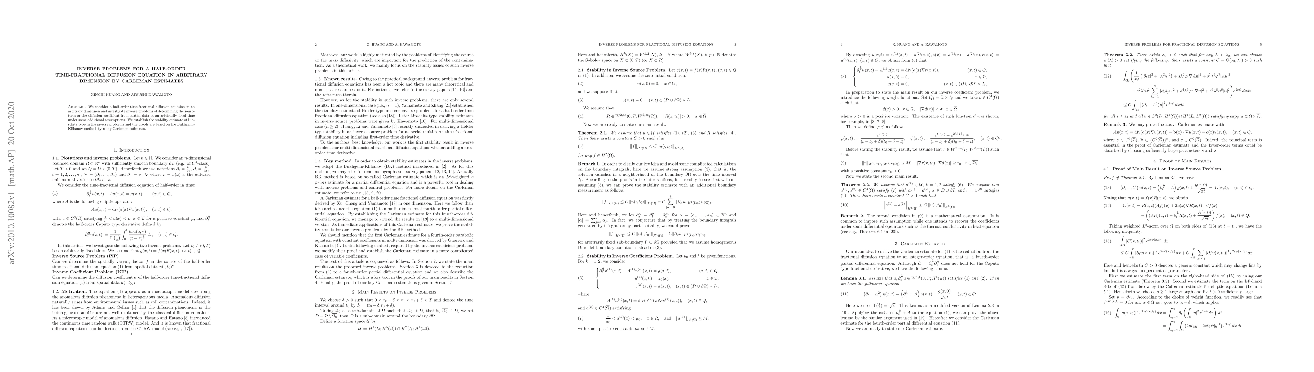 This paper investigates inverse problems for a half-order time-fractional diffusion equation in any dimension, focusing on determining the source term or diffusion coefficient from spatial data. Stability estimates of Lipschitz type are established using the Bukhgeim-Klibanov method and Carleman estimates.