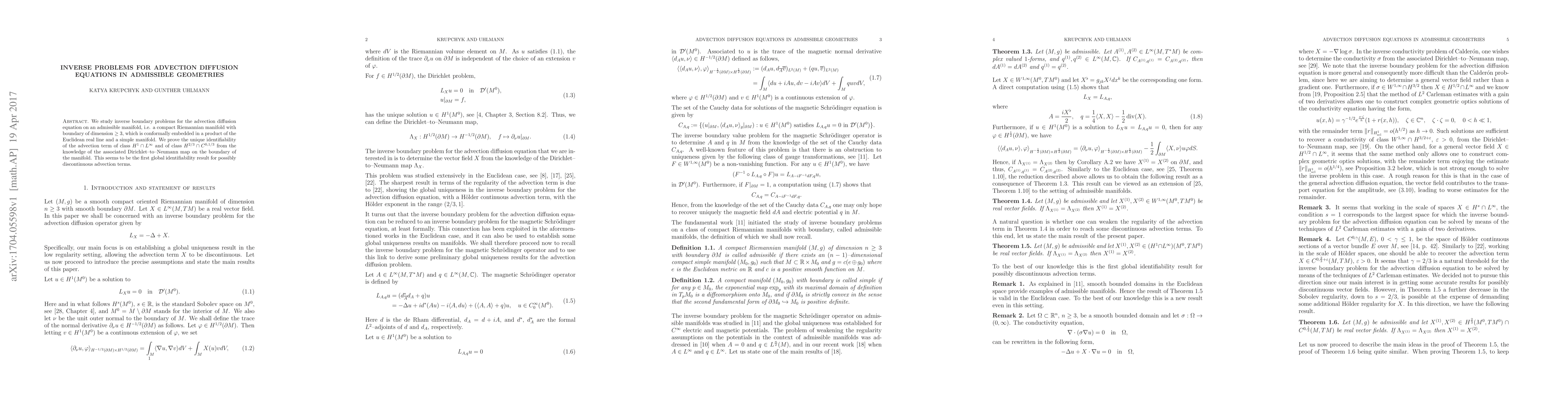 We study inverse boundary problems for the advection diffusion equation on an admissible manifold, i.e. a compact Riemannian manifold with boundary of dimension $\ge 3$, which is conformally embedded in a product of the Euclidean real line and a simple manifold. We prove the unique identifiability of the advection term of class $H^1\cap L^\infty$ and of class $H^{2/3}\cap C^{0,1/3}$ from the knowledge of the associated Dirichlet-to-Neumann map on the boundary of the manifold. This seems to be the first global identifiability result for possibly discontinuous advection terms.