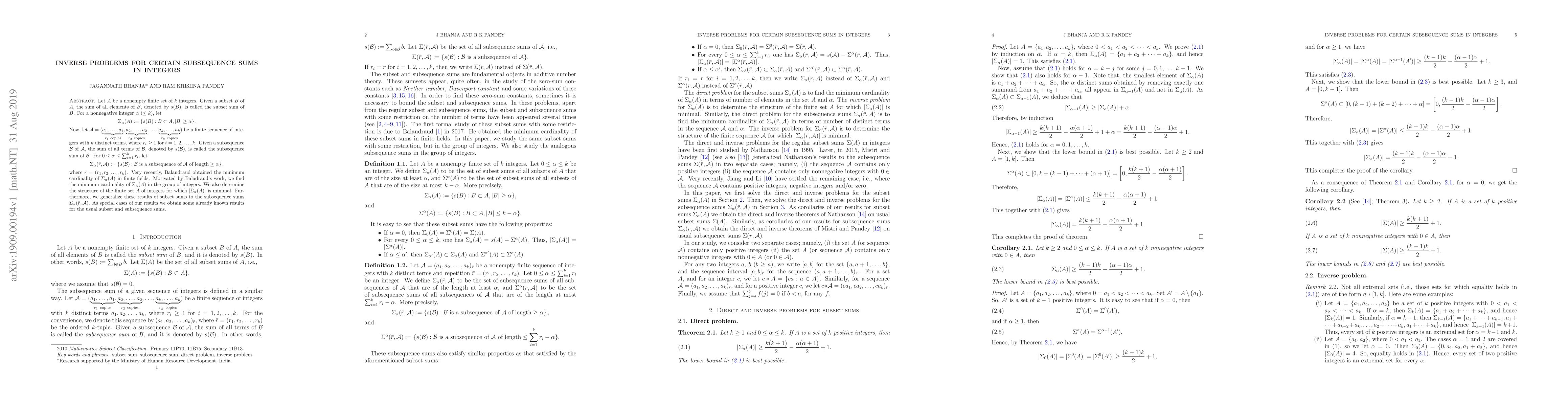 Let $A$ be a nonempty finite set of $k$ integers. Given a subset $B$ of $A$, the sum of all elements of $B$, denoted by $s(B)$, is called the subset sum of $B$. For a nonnegative integer $\alpha$ ($\leq k$), let \[\Sigma_{\alpha} (A):=\{s(B): B \subset A, |B|\geq \alpha\}.\] Now, let $\mathcal{A}=(\underbrace{a_{1},\ldots,a_{1}}_{r_{1}~\text{copies}}, \underbrace{a_{2},\ldots,a_{2}}_{r_{2}~\text{copies}},\ldots, \underbrace{a_{k},\ldots,a_{k}}_{r_{k}~\text{copies}})$ be a finite sequence of integers with $k$ distinct terms, where $r_{i}\geq 1$ for $i=1,2,\ldots,k$. Given a subsequence $\mathcal{B}$ of $\mathcal{A}$, the sum of all terms of $\mathcal{B}$, denoted by $s(\mathcal{B})$, is called the subsequence sum of $\mathcal{B}$. For $0\leq \alpha \leq \sum_{i=1}^{k} r_{i}$, let \[\Sigma_{\alpha} (\bar{r},\mathcal{A}):=\left\{s(\mathcal{B}): \mathcal{B}~\text{is a subsequence of}~\mathcal{A}~\text{of length} \geq \alpha \right\},\] where $\bar{r}=(r_{1},r_{2},\ldots,r_{k})$. Very recently, Balandraud obtained the minimum cardinality of $\Sigma_{\alpha} (A)$ in finite fields. Motivated by Baladraud's work, we find the minimum cardinality of $\Sigma_{\alpha}(A)$ in the group of integers. We also determine the structure of the finite set $A$ of integers for which $|\Sigma_{\alpha} (A)|$ is minimal. Furthermore, we generalize these results of subset sums to the subsequence sums $\Sigma_{\alpha} (\bar{r},\mathcal{A})$. As special cases of our results we obtain some already known results for the usual subset and subsequence sums.
