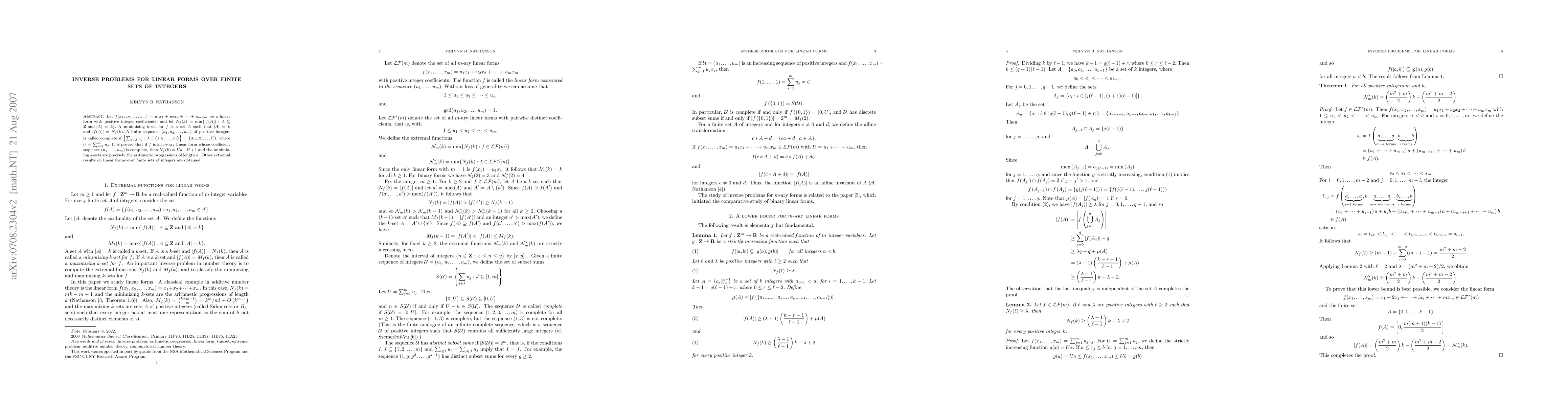 Let f(x_1,x_2,...,x_m) = u_1x_1+u_2 x_2+... + u_mx_m be a linear form with positive integer coefficients, and let N_f(k) = min{|f(A)| : A \subseteq Z and |A|=k}. A minimizing k-set for f is a set A such that |A|=k and |f(A)| = N_f(k). A finite sequence (u_1, u_2,...,u_m) of positive integers is called complete if {\sum_{j\in J} u_j : J \subseteq {1,2,..,m}} = {0,1,2,..., U}, where $U = \sum_{j=1}^m u_j.$ It is proved that if f is an m-ary linear form whose coefficient sequence (u_1,...,u_m) is complete, then N_f(k) = Uk-U+1 and the minimizing k-sets are precisely the arithmetic progressions of length k. Other extremal results on linear forms over finite sets of integers are obtained.