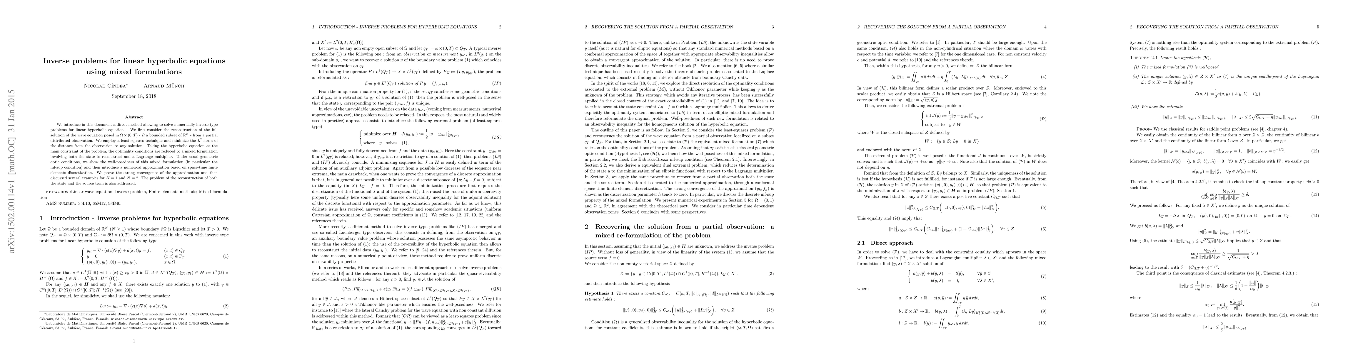 This paper presents a method for solving inverse problems for linear hyperbolic equations using mixed formulations, focusing on reconstructing the full solution from partial observations. It employs a least-squares approach and proves the well-posedness of the mixed formulation, followed by a numerical approximation using space-time finite elements, demonstrating strong convergence and applying it to examples for dimensions $N=1$ and $N=2.