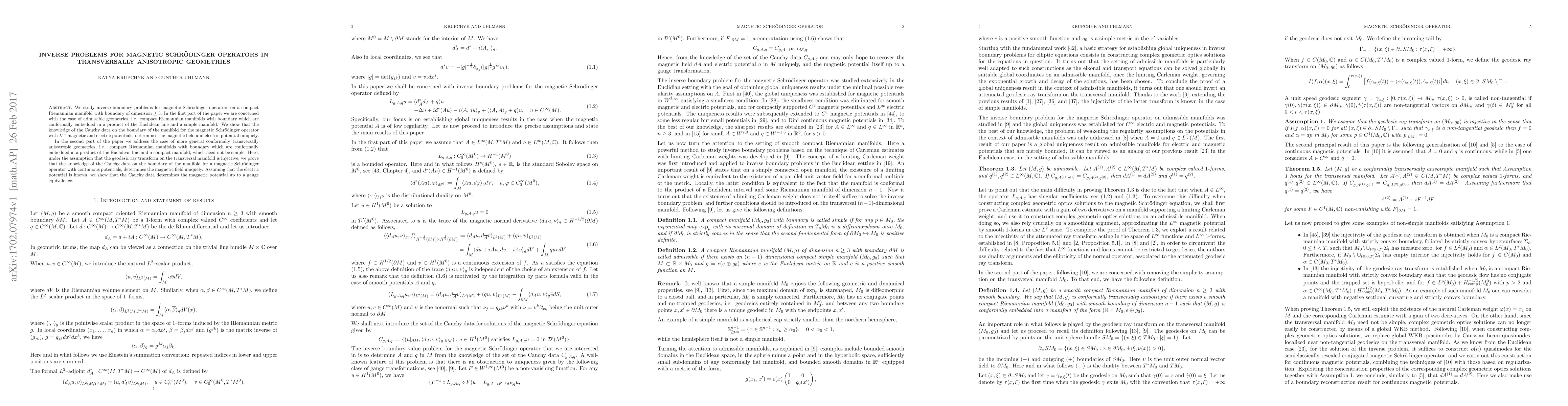 This paper explores inverse boundary problems for magnetic Schrödinger operators in various geometries. It demonstrates that Cauchy data on the boundary uniquely determines the magnetic and electric potentials in admissible geometries, and the magnetic field in more general conformally anisotropic geometries, provided certain conditions are met.