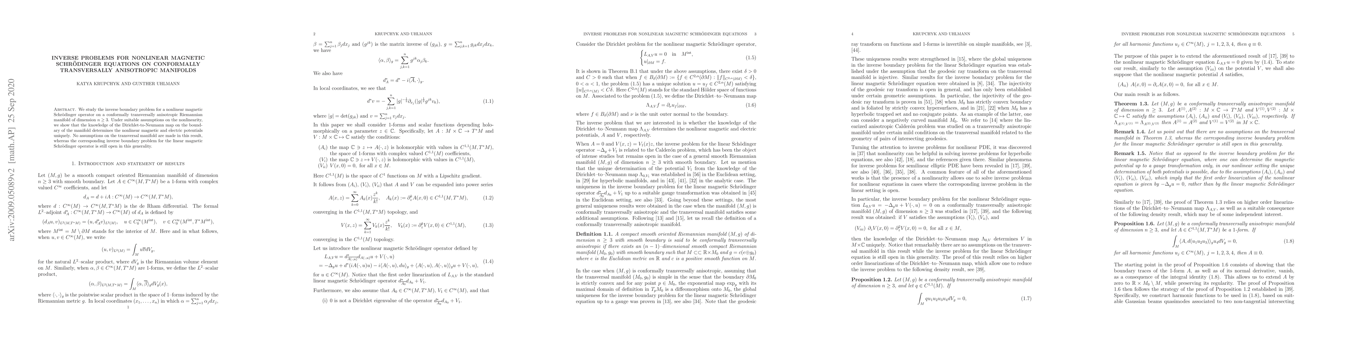 We study the inverse boundary problem for a nonlinear magnetic Schr\"odinger operator on a conformally transversally anisotropic Riemannian manifold of dimension $n\ge 3$. Under suitable assumptions on the nonlinearity, we show that the knowledge of the Dirichlet-to-Neumann map on the boundary of the manifold determines the nonlinear magnetic and electric potentials uniquely. No assumptions on the transversal manifold are made in this result, whereas the corresponding inverse boundary problem for the linear magnetic Schr\"odinger operator is still open in this generality.