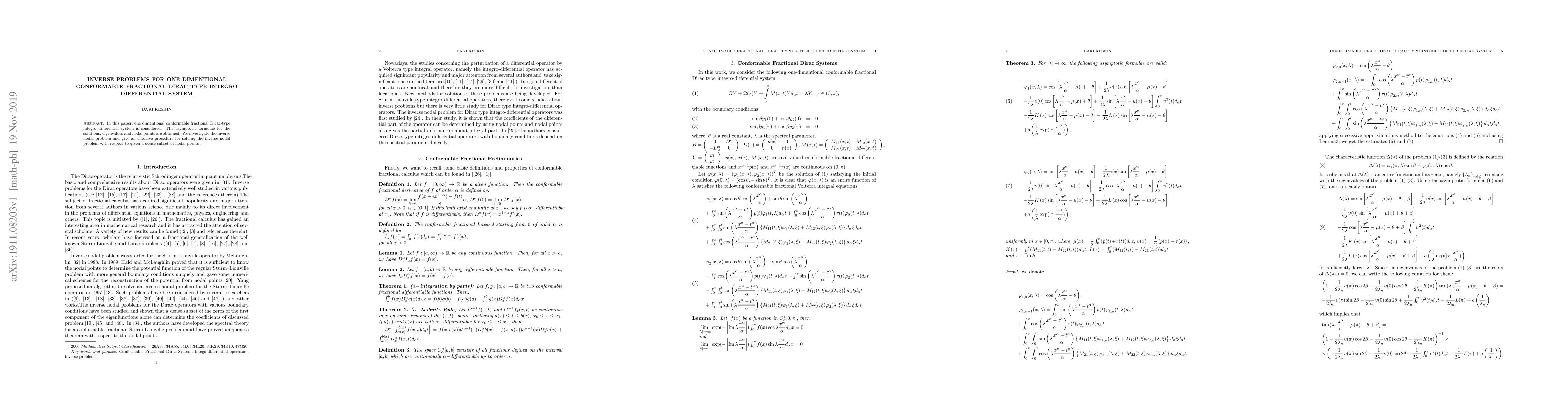 This paper studies a one-dimensional conformable fractional Dirac-type integro differential system, deriving asymptotic formulae for solutions, eigenvalues, and nodal points. It also investigates the inverse nodal problem and provides an effective method for solving it based on a dense subset of nodal points.