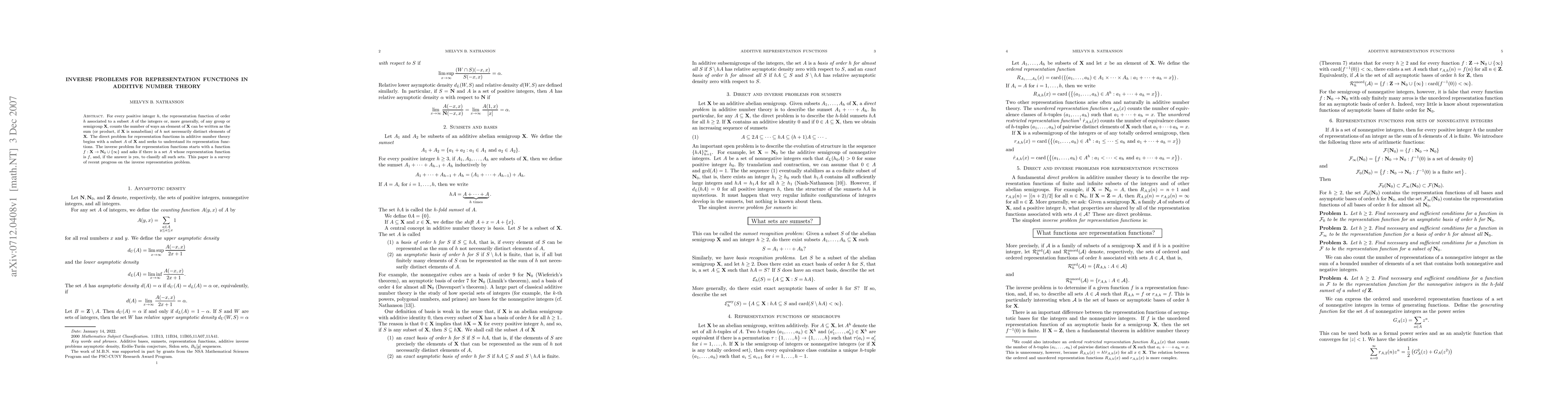 This paper surveys recent advancements in solving the inverse problem for representation functions in additive number theory, focusing on identifying sets whose representation functions match a given function, and classifying such sets. It highlights significant progress in understanding these complex mathematical structures.
