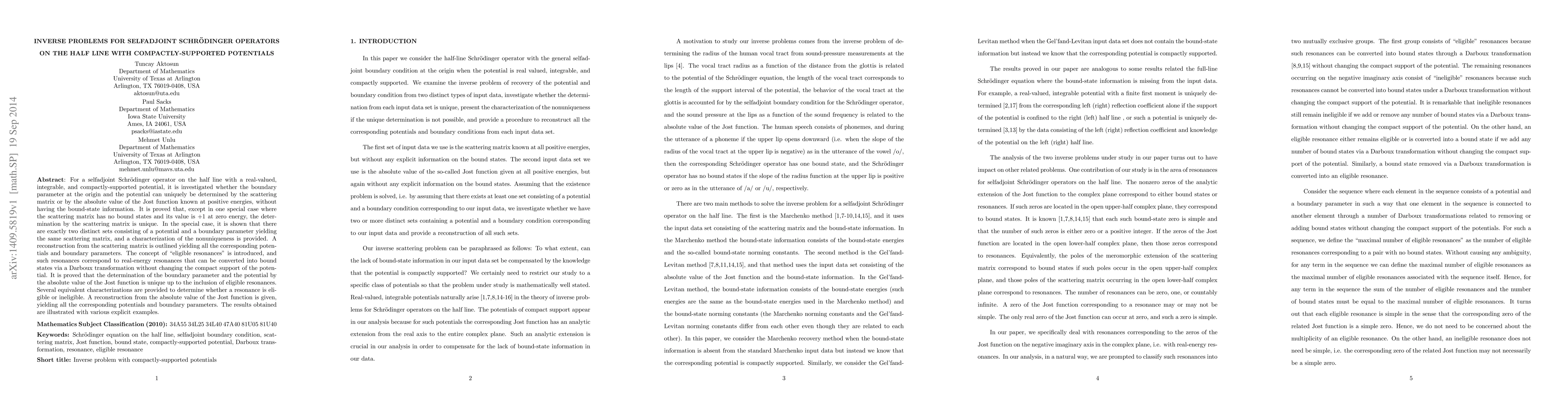 This paper investigates the uniqueness of determining selfadjoint Schrödinger operators on the half line with compactly-supported potentials from scattering matrices or Jost functions. It proves that the scattering matrix uniquely determines the potential and boundary parameter except in a special case, while the Jost function's absolute value uniquely determines them up to eligible resonances, with explicit reconstruction methods provided.