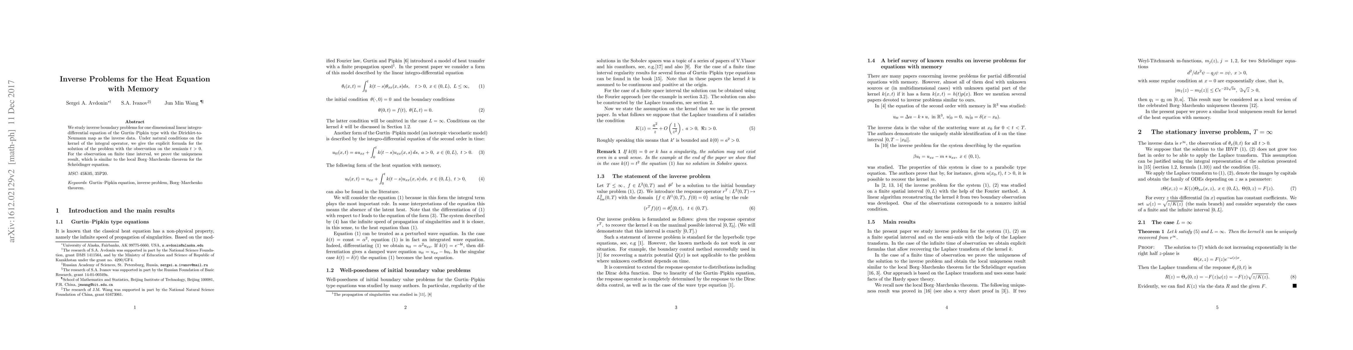 This research paper solves an inverse problem for a one-dimensional heat equation with memory, providing an explicit formula for the solution under natural conditions on the kernel of the integral operator. It also proves uniqueness results for observations on finite time intervals.