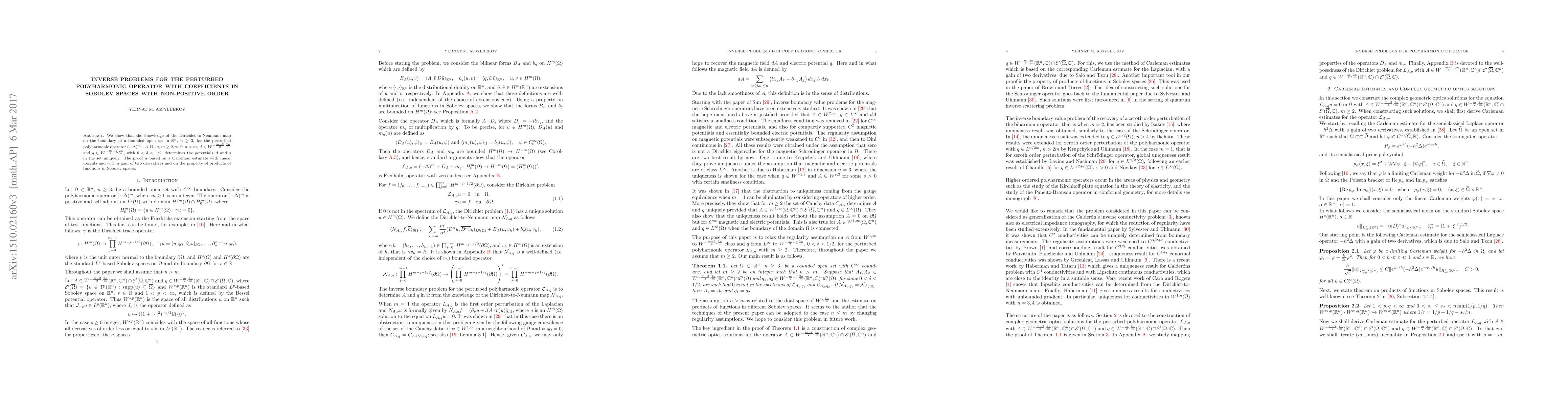 We show that the knowledge of the Dirichlet-to-Neumann map on the boundary of a bounded open set in $\mathbb R^n$, $n\ge 3$, for the perturbed polyharmonic operator $(-\Delta)^m+A\cdot D+q$, $m\ge 2$, with $n>m$, $A\in W^{-\frac{m-2}{2},\frac{2n}{m}}$ and $q\in W^{-\frac{m}{2}+\delta,\frac{2n}{m}}$, with $0<\delta<1/2$, determines the potentials $A$ and $q$ in the set uniquely. The proof is based on a Carleman estimate with linear weights and with a gain of two derivatives and on the property of products of functions in Sobolev spaces.