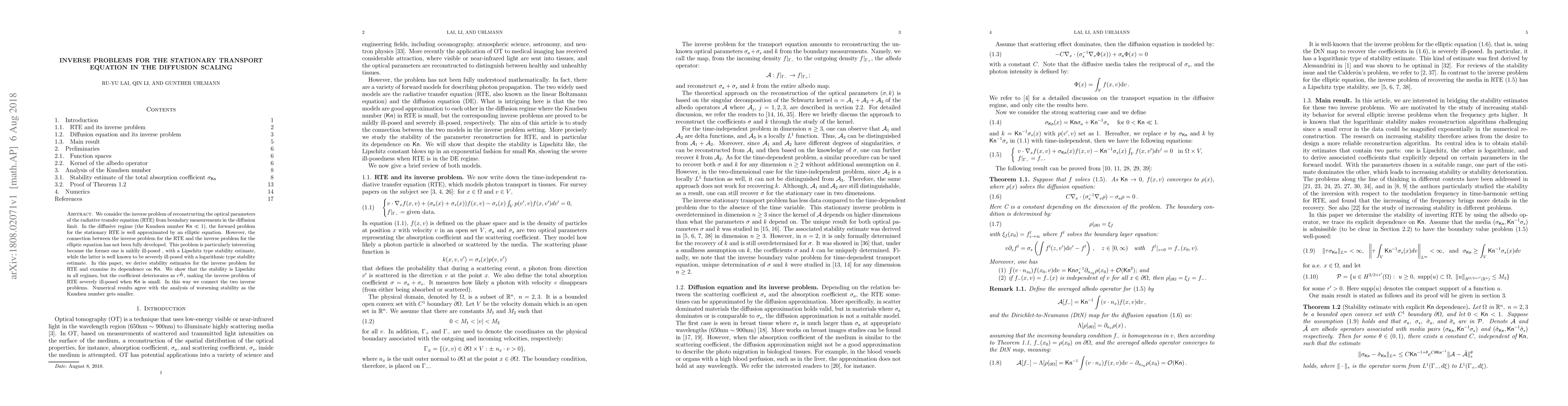 We consider the inverse problem of reconstructing the optical parameters of the radiative transfer equation (RTE) from boundary measurements in the diffusion limit. In the diffusive regime (the Knudsen number $\mathsf{Kn}\ll 1$), the forward problem for the stationary RTE is well approximated by an elliptic equation. However, the connection between the inverse problem for the RTE and the inverse problem for the elliptic equation has not been fully developed. This problem is particularly interesting because the former one is mildly ill-posed , with a Lipschitz type stability estimate, while the latter is well known to be severely ill-posed with a logarithmic type stability estimate. In this paper, we derive stability estimates for the inverse problem for RTE and examine its dependence on $\mathsf{Kn}$. We show that the stability is Lipschitz in all regimes, but the coefficient deteriorates as $e^{\frac{1}{\mathsf{Kn}}}$, making the inverse problem of RTE severely ill-posed when $\mathsf{Kn}$ is small. In this way we connect the two inverse problems. Numerical results agree with the analysis of worsening stability as the Knudsen number gets smaller.
