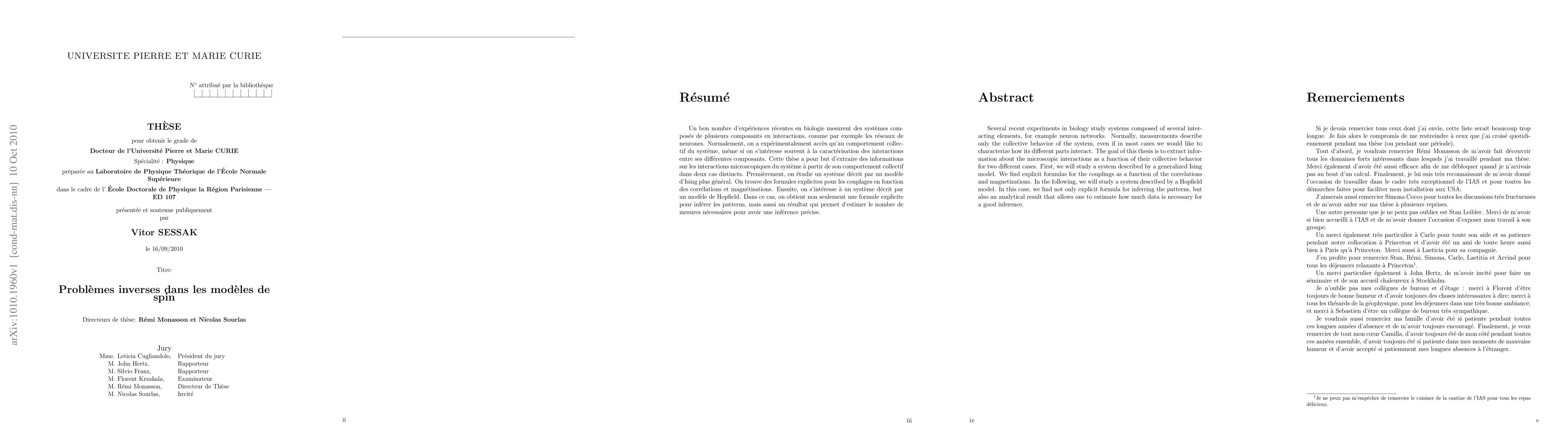 Several recent experiments in biology study systems composed of several interacting elements, for example neuron networks. Normally, measurements describe only the collective behavior of the system, even if in most cases we would like to characterize how its different parts interact. The goal of this thesis is to extract information about the microscopic interactions as a function of their collective behavior for two different cases. First, we will study a system described by a generalized Ising model. We find explicit formulas for the couplings as a function of the correlations and magnetizations. In the following, we will study a system described by a Hopfield model. In this case, we find not only explicit formula for inferring the patterns, but also an analytical result that allows one to estimate how much data is necessary for a good inference.