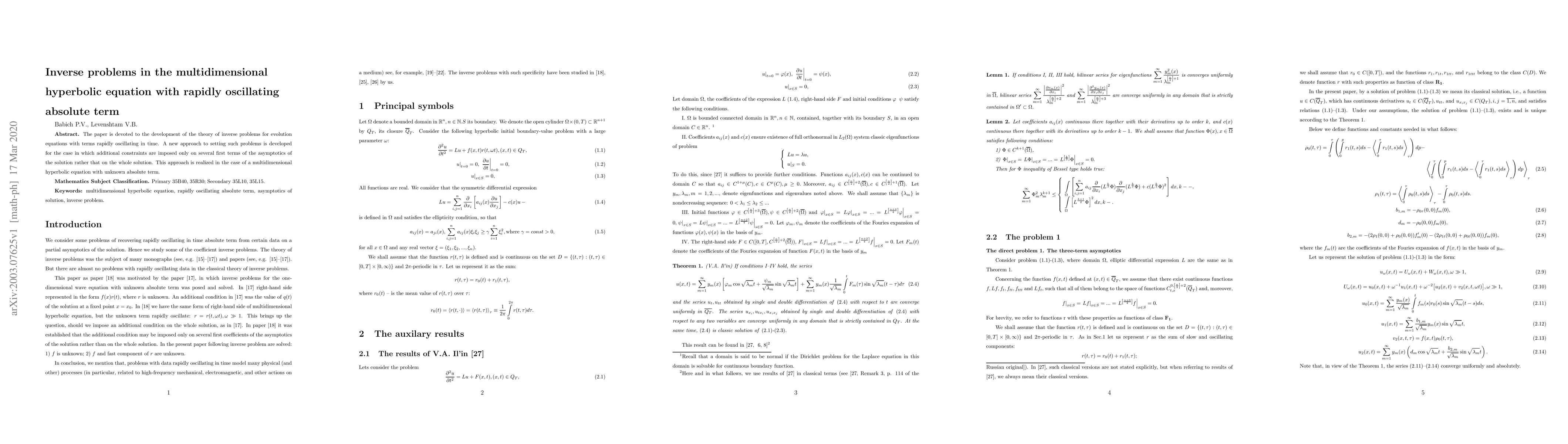 Summary: This paper develops a novel approach to solving inverse problems for multidimensional hyperbolic equations with rapidly oscillating terms, focusing on constraints applied to initial asymptotic terms rather than the entire solution. The method is demonstrated for equations with an unknown absolute term.