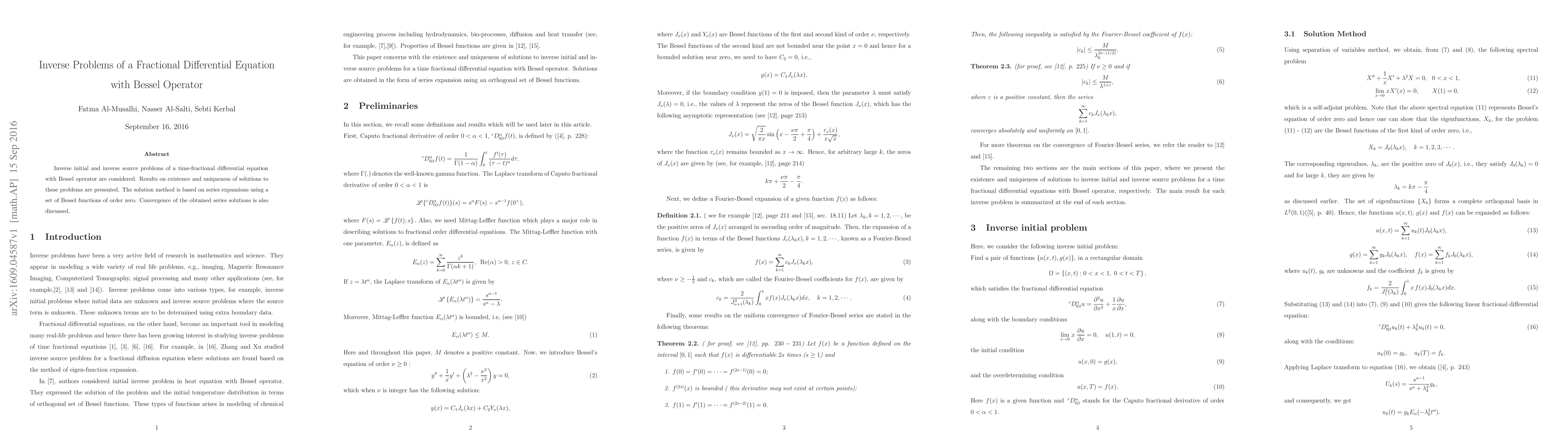 Summary: This paper investigates inverse initial and source problems for a time-fractional differential equation involving a Bessel operator, proving existence and uniqueness of solutions through series expansions utilizing Bessel functions, and discussing the convergence of these series solutions.
