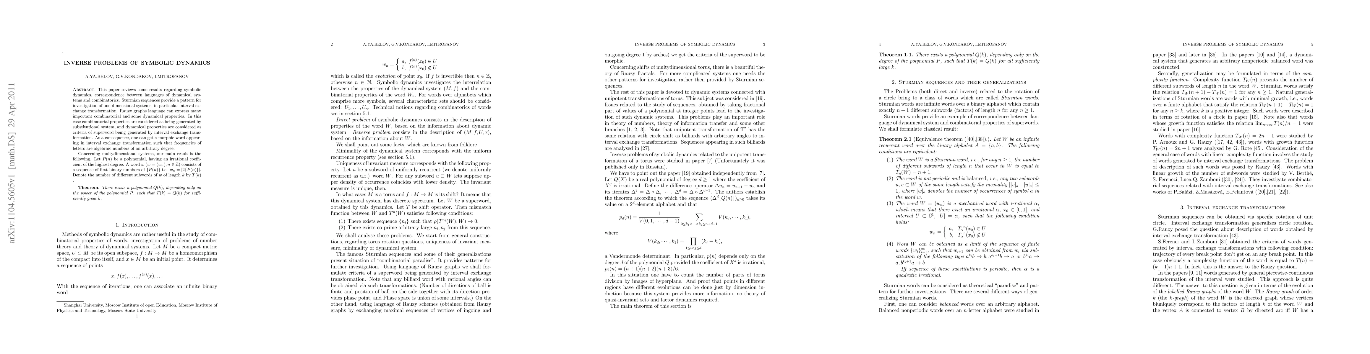 This paper reviews some results regarding symbolic dynamics, correspondence between languages of dynamical systems and combinatorics. Sturmian sequences provide a pattern for investigation of one-dimensional systems, in particular interval exchange transformation. Rauzy graphs language can express many important combinatorial and some dynamical properties. In this case combinatorial properties are considered as being generated by substitutional system, and dynamical properties are considered as criteria of superword being generated by interval exchange transformation. As a consequence, one can get a morphic word appearing in interval exchange transformation such that frequencies of letters are algebraic numbers of an arbitrary degree. Concerning multydimensional systems, our main result is the following. Let P(n) be a polynomial, having an irrational coefficient of the highest degree. A word $w$ $(w=(w_n), n\in \nit)$ consists of a sequence of first binary numbers of $\{P(n)\}$ i.e. $w_n=[2\{P(n)\}]$. Denote the number of different subwords of $w$ of length $k$ by $T(k)$ . \medskip {\bf Theorem.} {\it There exists a polynomial $Q(k)$, depending only on the power of the polynomial $P$, such that $T(k)=Q(k)$ for sufficiently great $k$.}