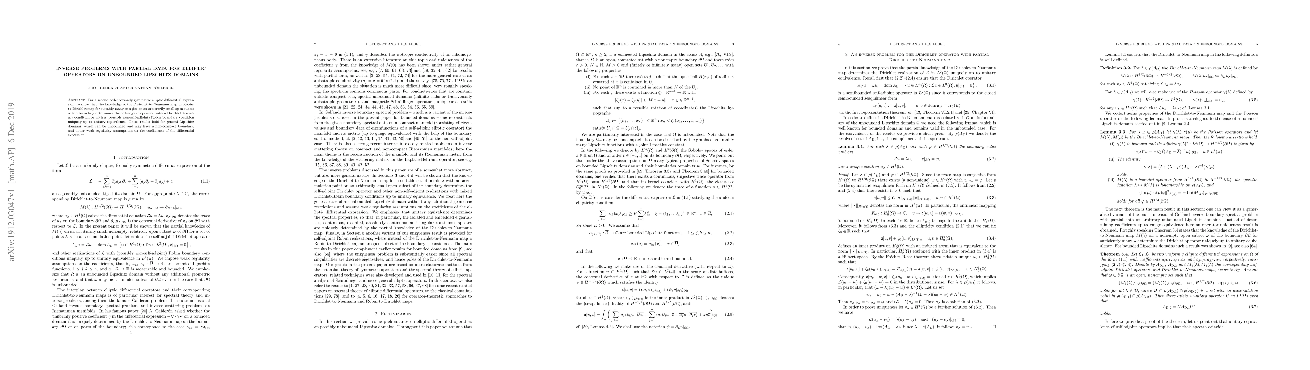 For a second order formally symmetric elliptic differential expression we show that the knowledge of the Dirichlet-to-Neumann map or Robin-to-Dirichlet map for suitably many energies on an arbitrarily small open subset of the boundary determines the self-adjoint operator with a Dirichlet boundary condition or with a (possibly non-self-adjoint) Robin boundary condition uniquely up to unitary equivalence. These results hold for general Lipschitz domains, which can be unbounded and may have a non-compact boundary, and under weak regularity assumptions on the coefficients of the differential expression.