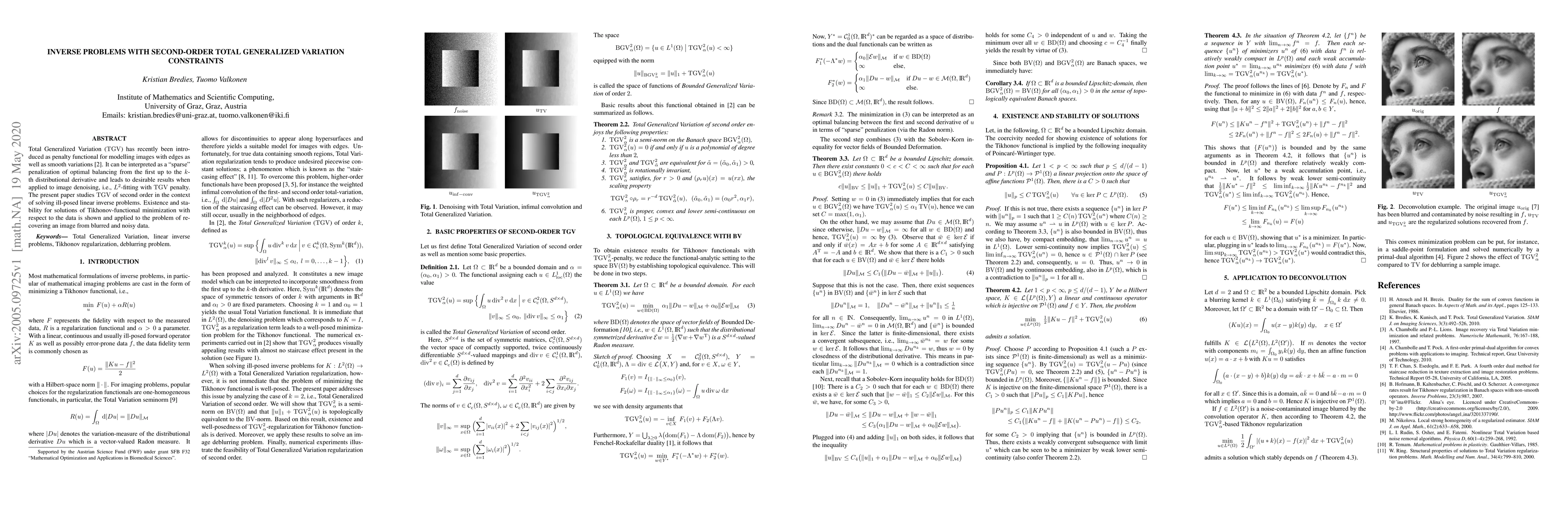 This paper investigates the use of second-order Total Generalized Variation (TGV) constraints to solve ill-posed linear inverse problems, demonstrating existence and stability of solutions. It applies the method to image recovery from blurred and noisy data, achieving effective denoising results.
