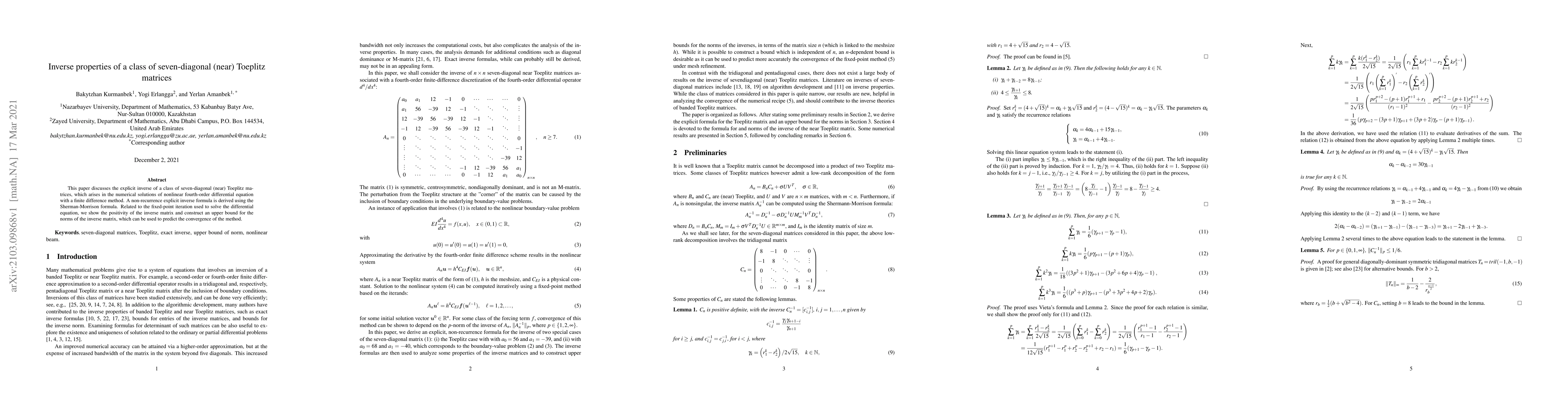 This paper derives an explicit inverse formula for a class of seven-diagonal (near) Toeplitz matrices using the Sherman-Morrison formula, which arises in solving nonlinear fourth-order differential equations with finite differences. It also establishes the positivity of the inverse matrix and provides an upper bound for its norms to predict the convergence of the numerical method.