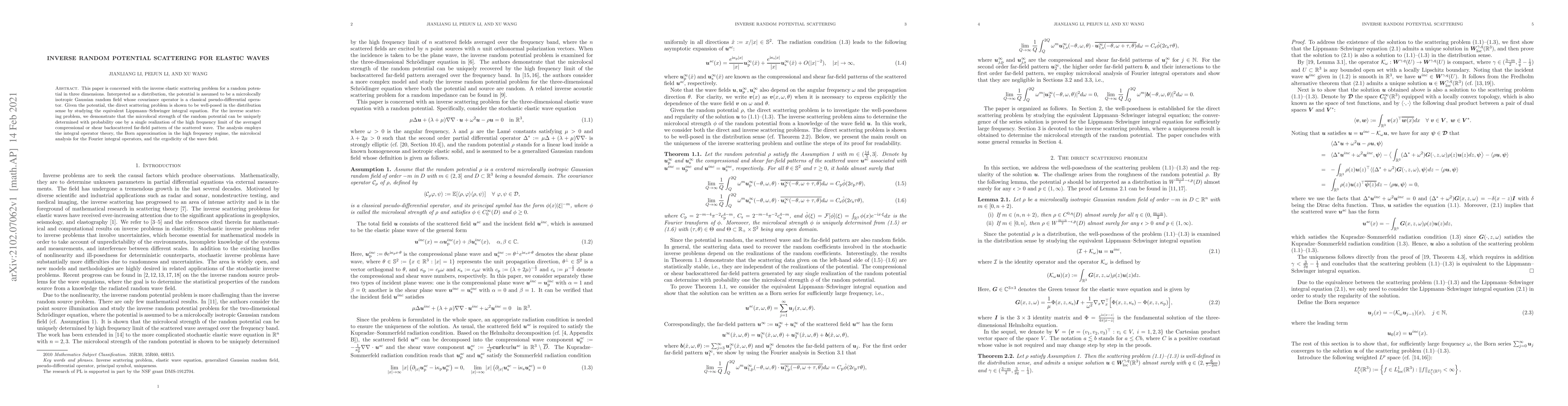 This paper investigates the inverse scattering problem for elastic waves in a three-dimensional random potential, demonstrating that the microlocal strength of the potential can be uniquely determined using high-frequency averaged backscattered wave patterns, leveraging integral operator theory and microlocal analysis.