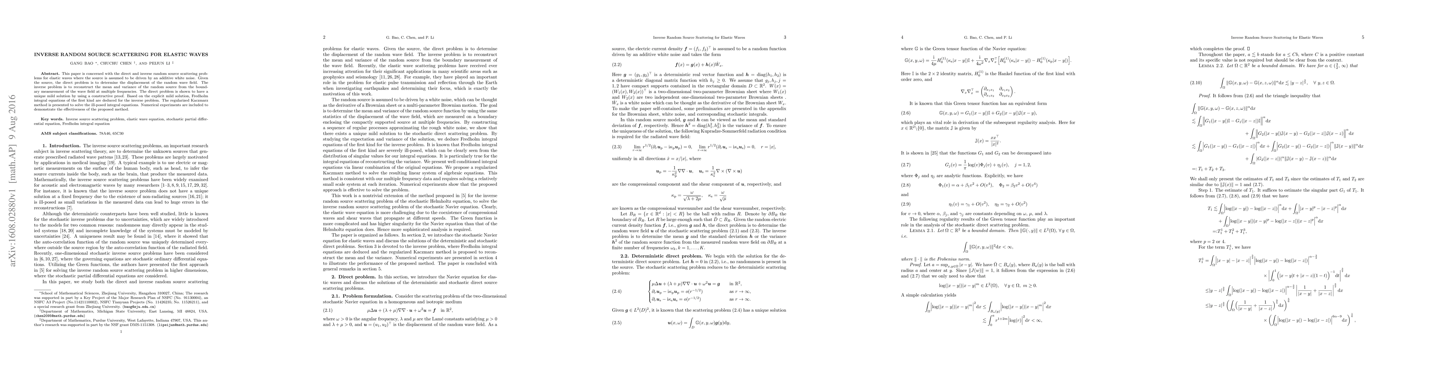This paper addresses the direct and inverse problems for elastic waves driven by an additive white noise source, proving a unique mild solution for the direct problem and deriving Fredholm integral equations for the inverse problem. A regularized Kaczmarz method is introduced to solve these ill-posed equations, validated through numerical experiments.