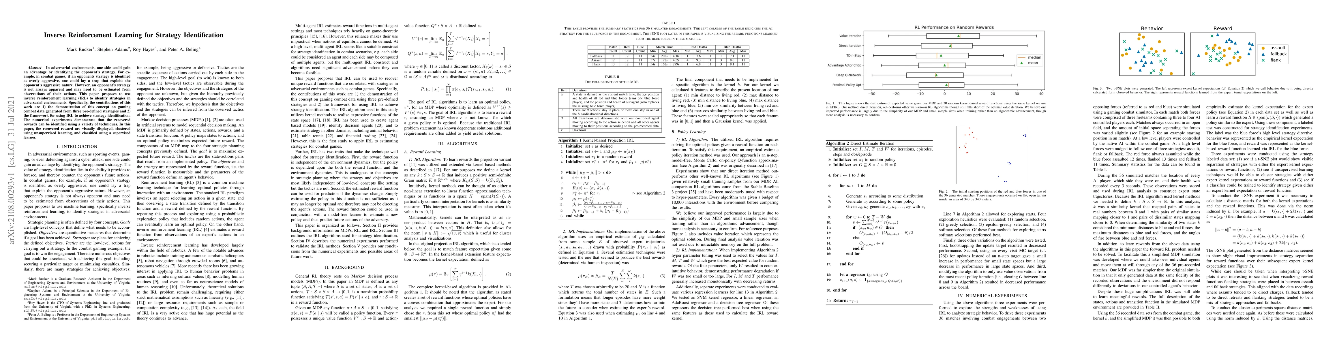 This paper proposes using inverse reinforcement learning to identify strategies in adversarial environments, successfully recovering rewards from gaming combat data through unsupervised and supervised learning techniques.