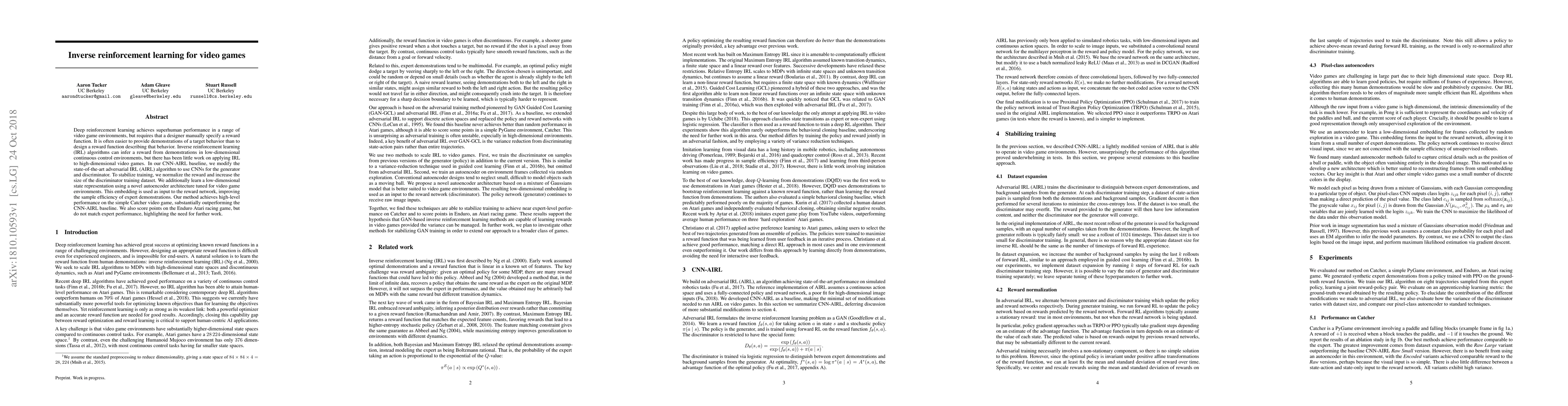 This paper proposes a CNN-based inverse reinforcement learning approach to infer reward functions from demonstrations in high-dimensional video game environments, achieving high-level performance in the Catcher game and partial success in Enduro. The method stabilizes training and improves sample efficiency using a novel autoencoder for low-dimensional state representation.